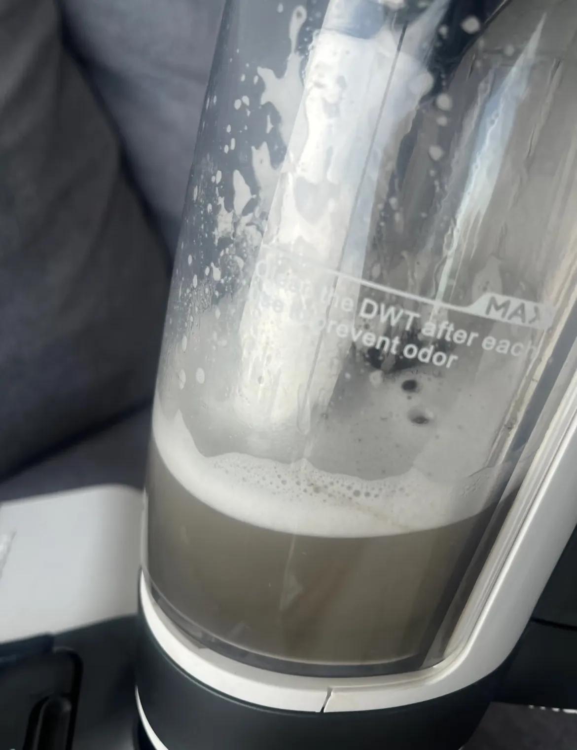 刷完之後再全地毯噴塗,反應兩分鐘之後,這時再用洗地機來回反覆吸,就跟布藝清洗機一樣,肉眼可見的地毯一點點變乾淨、水箱一點點變髒。