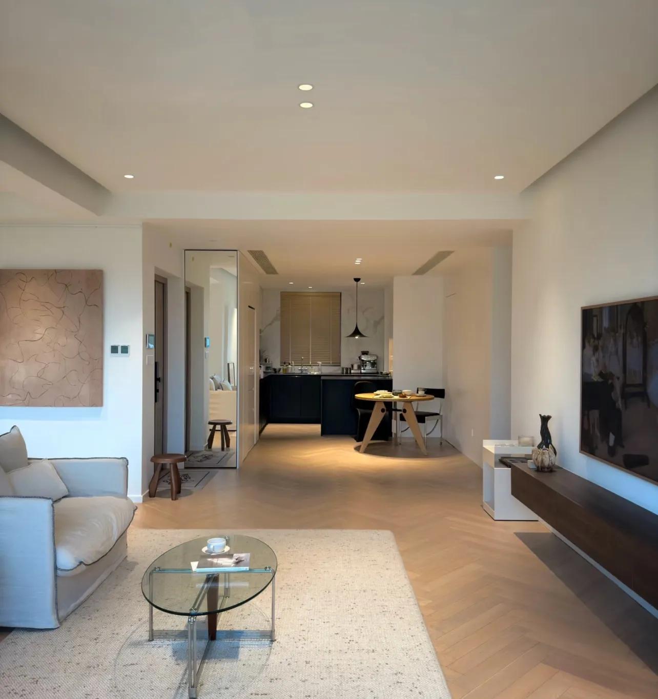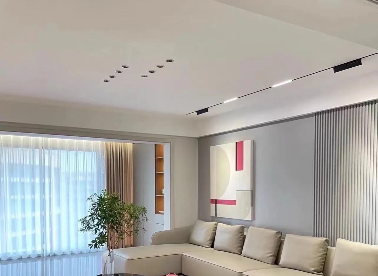 其實,我們講了很多遍,做無主燈最起碼的思路,就是根據傢俱去佈局,保證茶几、邊幾,上方有燈就可以。如果想要增加氛圍照明,再加燈帶就可以了!