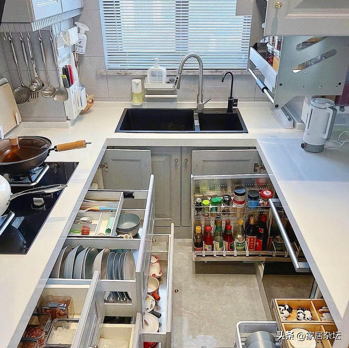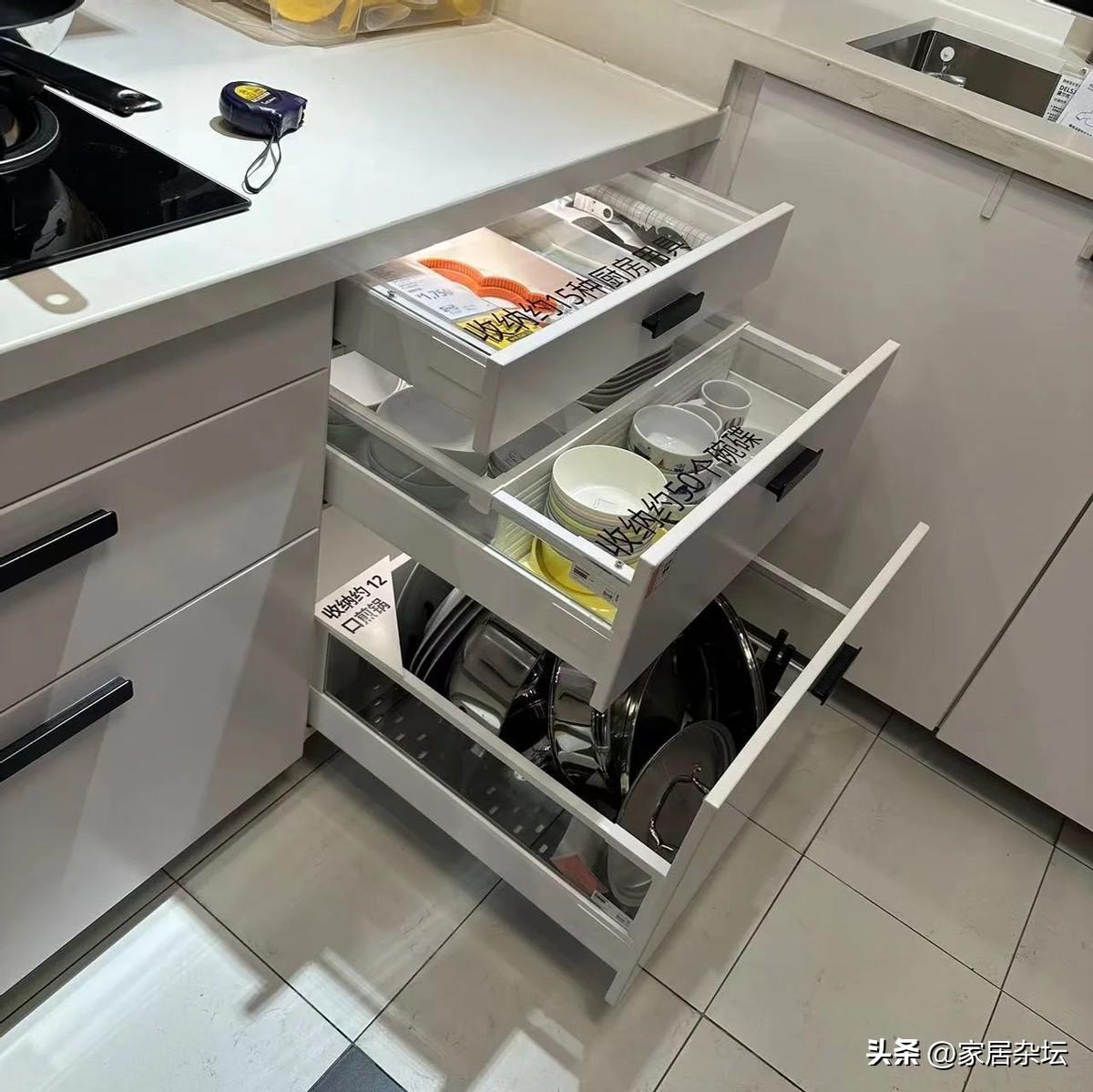 ①、對於櫃子,我們除了考慮一個放置碟子碗的拉籃櫃以外,其餘的都做成大抽屜。當然,前提是這個抽屜能夠完全打開。