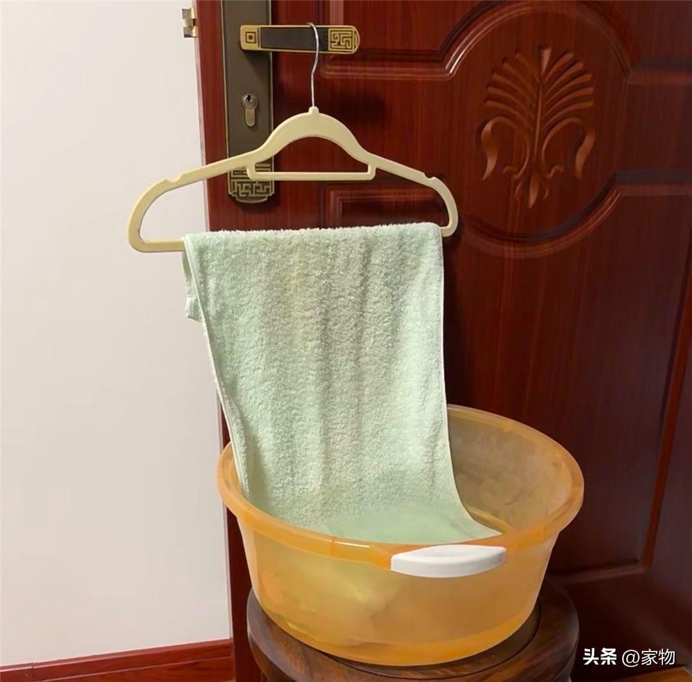 如果想要進一步增加加溼效果,就用衣架或手邊其他的家居用品,將毛巾掛起來,另一半還是浸泡到盆裏的水中,毛巾和空氣接觸面更大,加溼效果自然也就更強了。