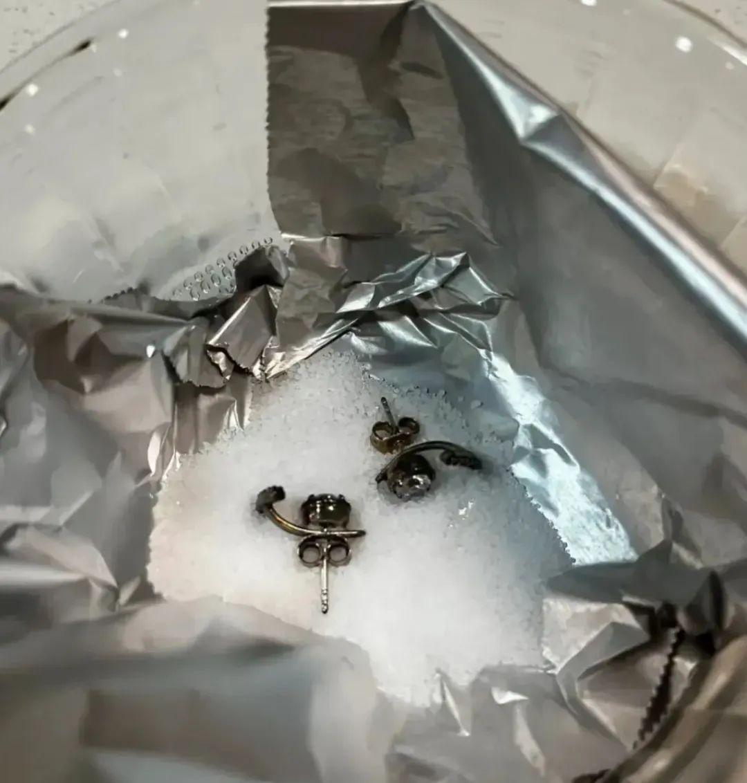 方法就是:先備好一勺鹽、錫紙和一個碗。接着,用錫紙將銀飾包裹起來。然後,在碗中放入鹽。之後,在碗中添加適量的開水。浸泡大約十分鐘後,將銀飾品取出,就洗乾淨啦~