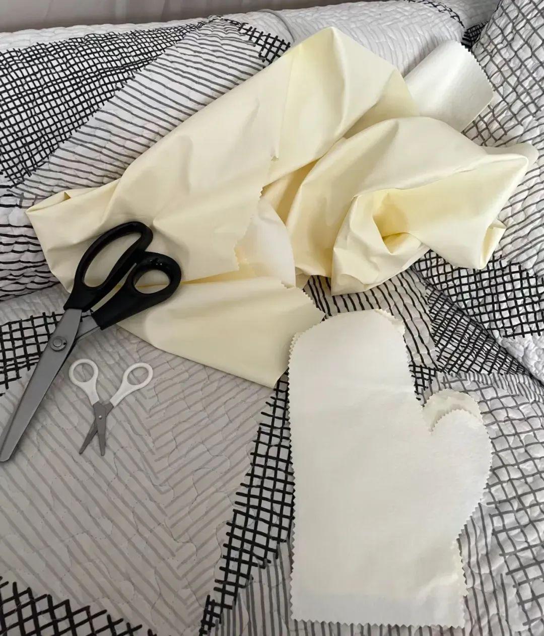 是的, 你沒聽錯, 就是沙發上會用到的科技布,然後動動小手,縫兩個手套,邊角料還能拿來多縫一個掛繩,一個塗身體乳,一個塗防曬~