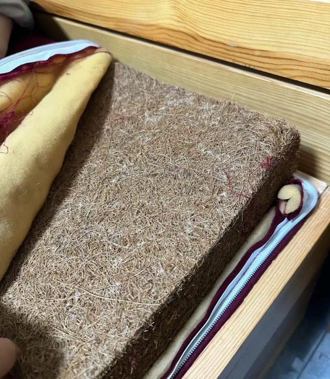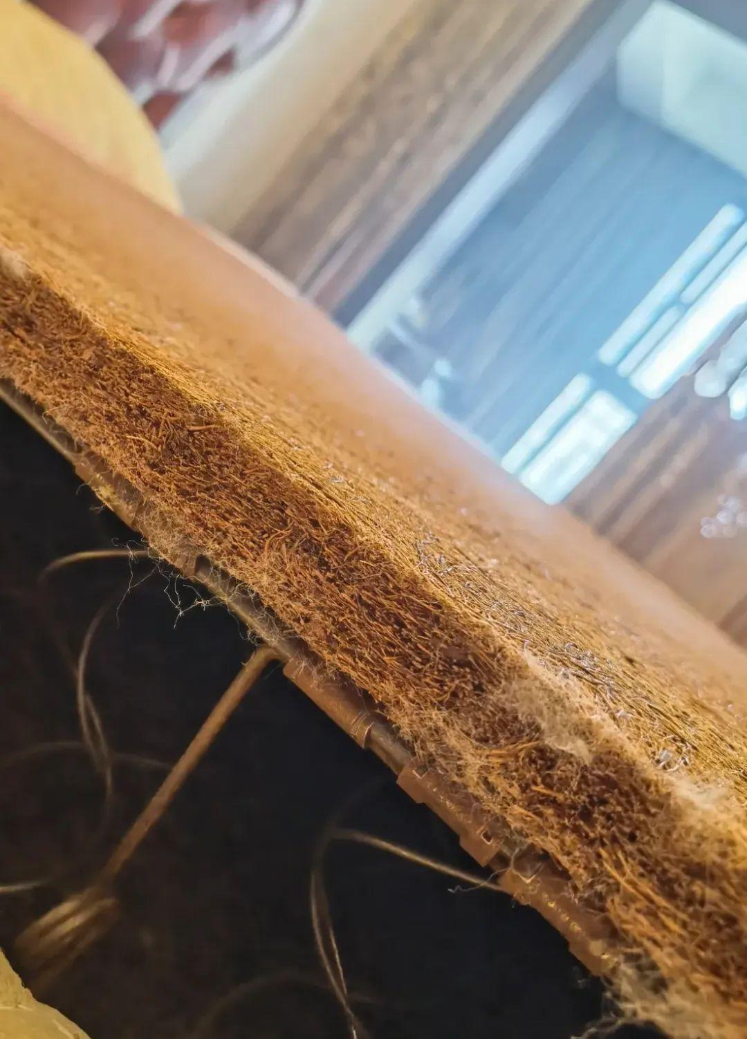 研究了很久才發現問題在這個牀墊上,拆開後看到裏面都是膠水粘合的棕絲,味道很刺鼻,我立刻扔掉給房間通風,後來測甲醛濃度很明顯降低到了安全值。