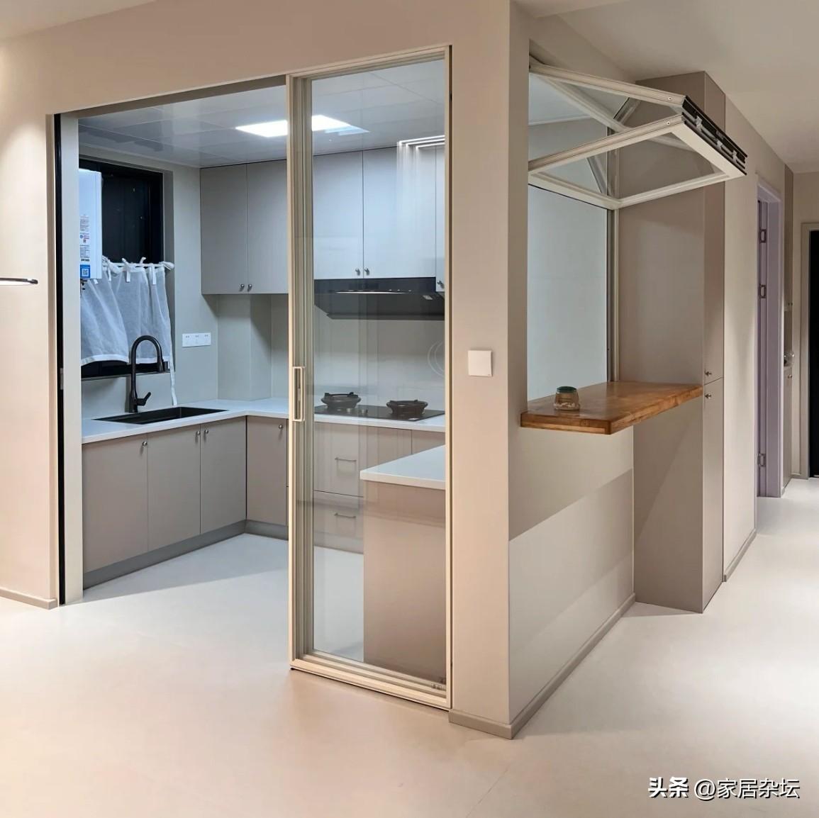 如果想做開放式廚房,其實這種方式也是很不錯的。例如玻璃是可以選擇推拉收縮的PD門。封閉,就是一道牆;展開,就是敞開式廚房。