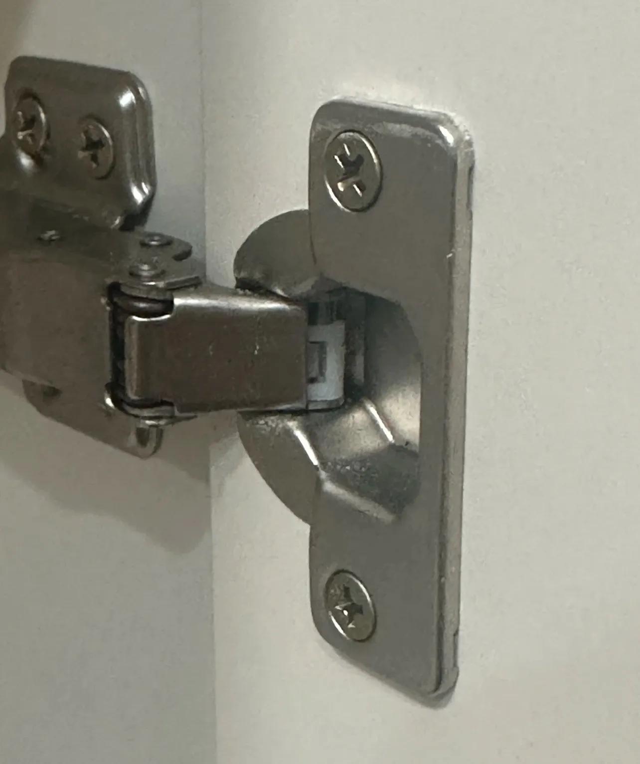 祕訣就是這個小小的限位器,把它塞進如下圖、鉸鏈的位置,以後再開櫃門就適時自動卡位停止,再也不用擔心櫃門撞牆了。