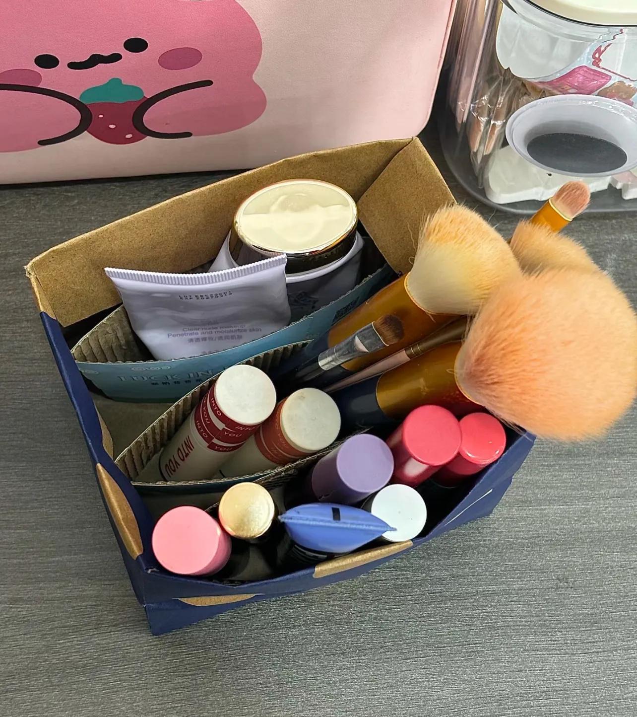 除了收納數據線,類似的操作還可以用來收納桌面雜物,杯套在袋子裏類似分格、支撐的作用,這不妥妥的一個分格收納盒麼。