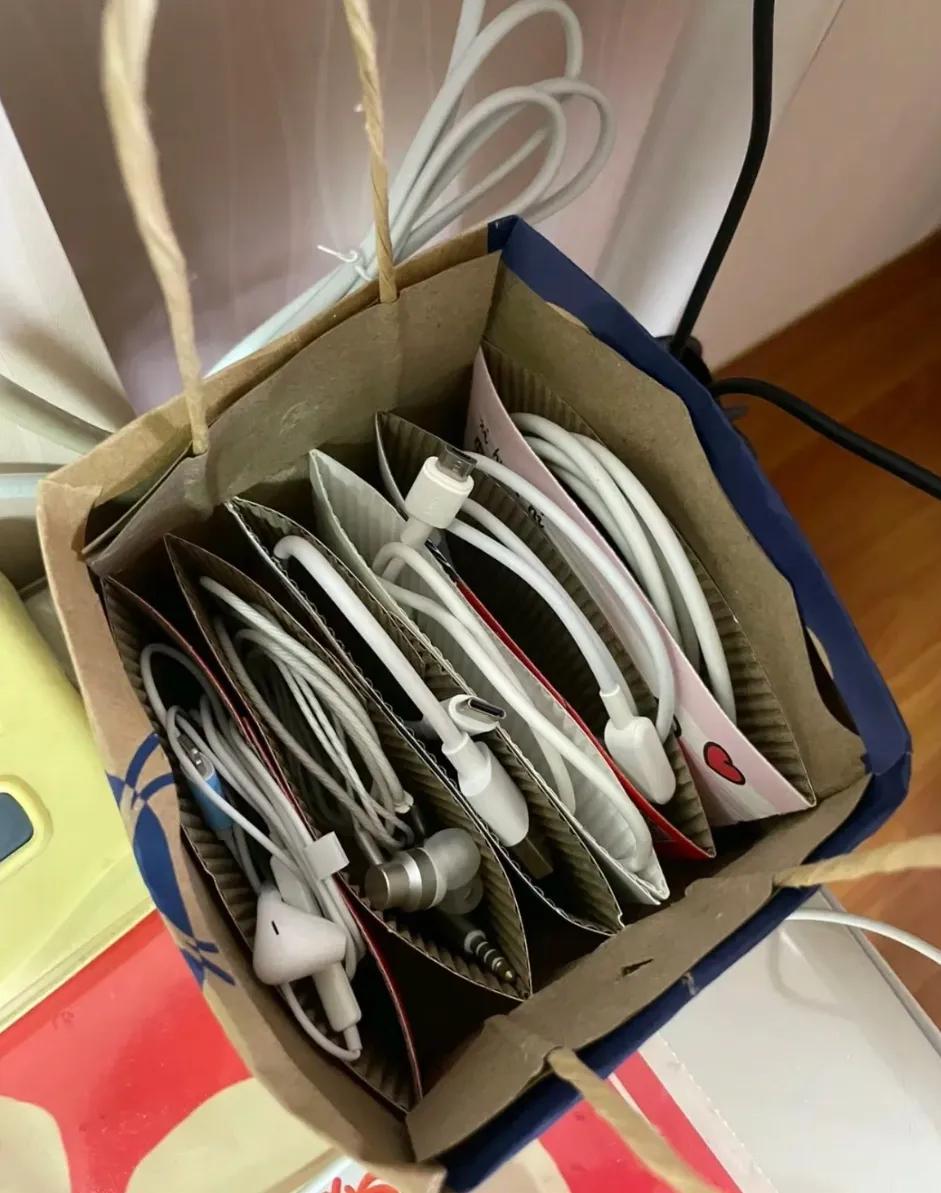 小小的一個奶茶袋,擠擠能塞下十來條數據線、耳機,比那種專門收納數據線用到盒子要省地方,關鍵廢物利用,不花錢。