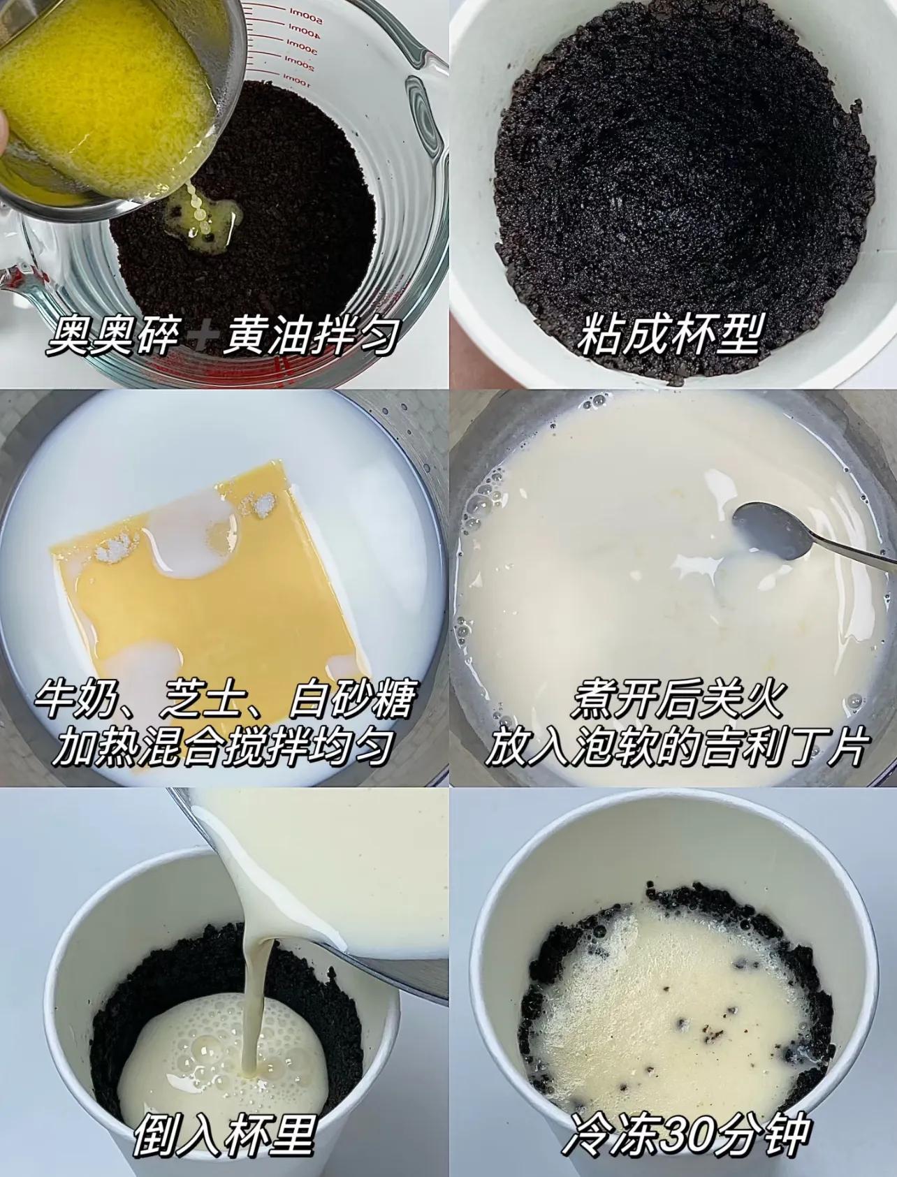 先用把奧利奧研碎,再用黃油拌勻,在杯子周圍塗抹一圈,沾杯成型。
