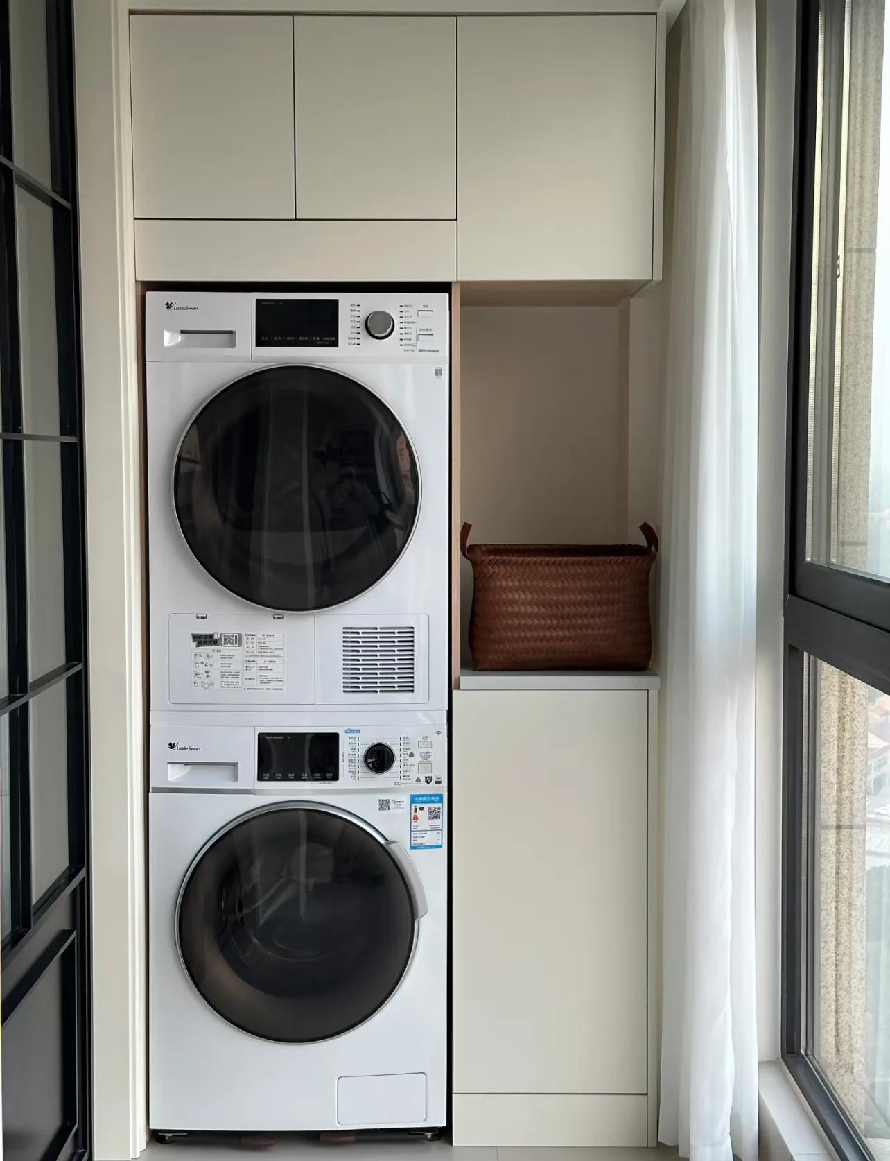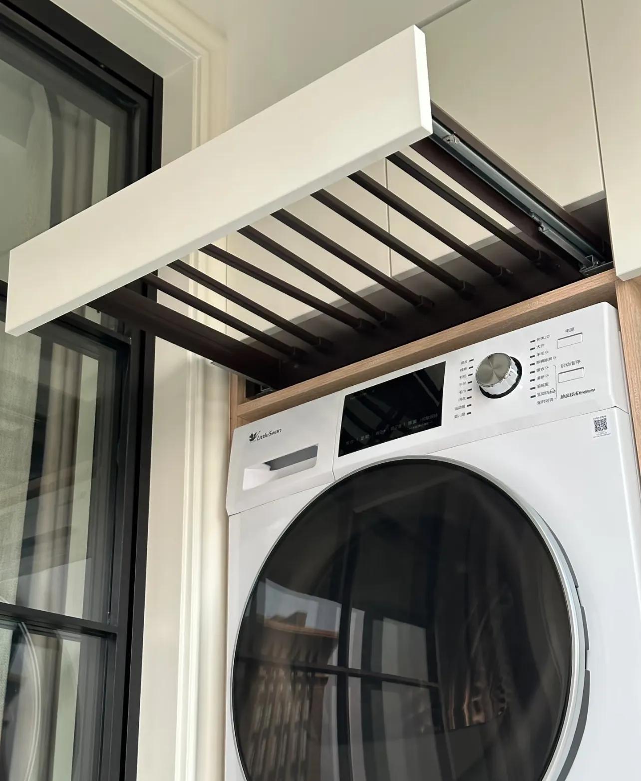 只需要將原本的櫃門板縮短,下面換成遮蓋晾衣架存在的橫版就行,成本不高又很完美的設計,值得所有有烘乾機的家庭抄作業。