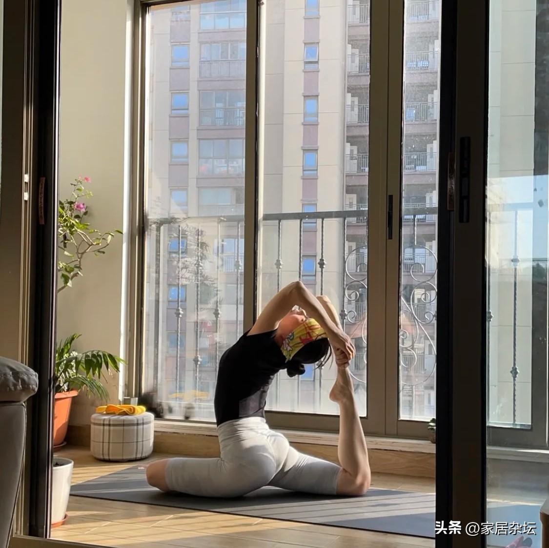 陽臺瑜伽區。如果女生喜歡練瑜伽,在陽臺鋪一塊瑜伽墊。練瑜伽,看到外面的陽光,也是很愜意的。