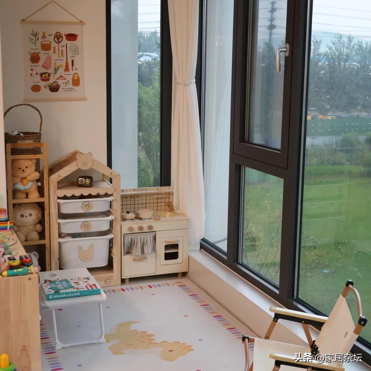 我們只需要在陽臺,鋪上一層厚一些的爬行墊。然後,窗戶安裝好護欄。之後,就可以在這個區域設置出一個非常不錯的兒童區。