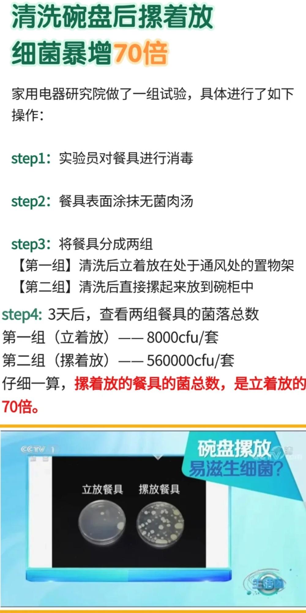 之前央視一檔生活圈節目,就找到家用電器研究院做過這樣一組實驗,實驗發現疊放餐具滋生的菌落數居然是立着放的70倍。