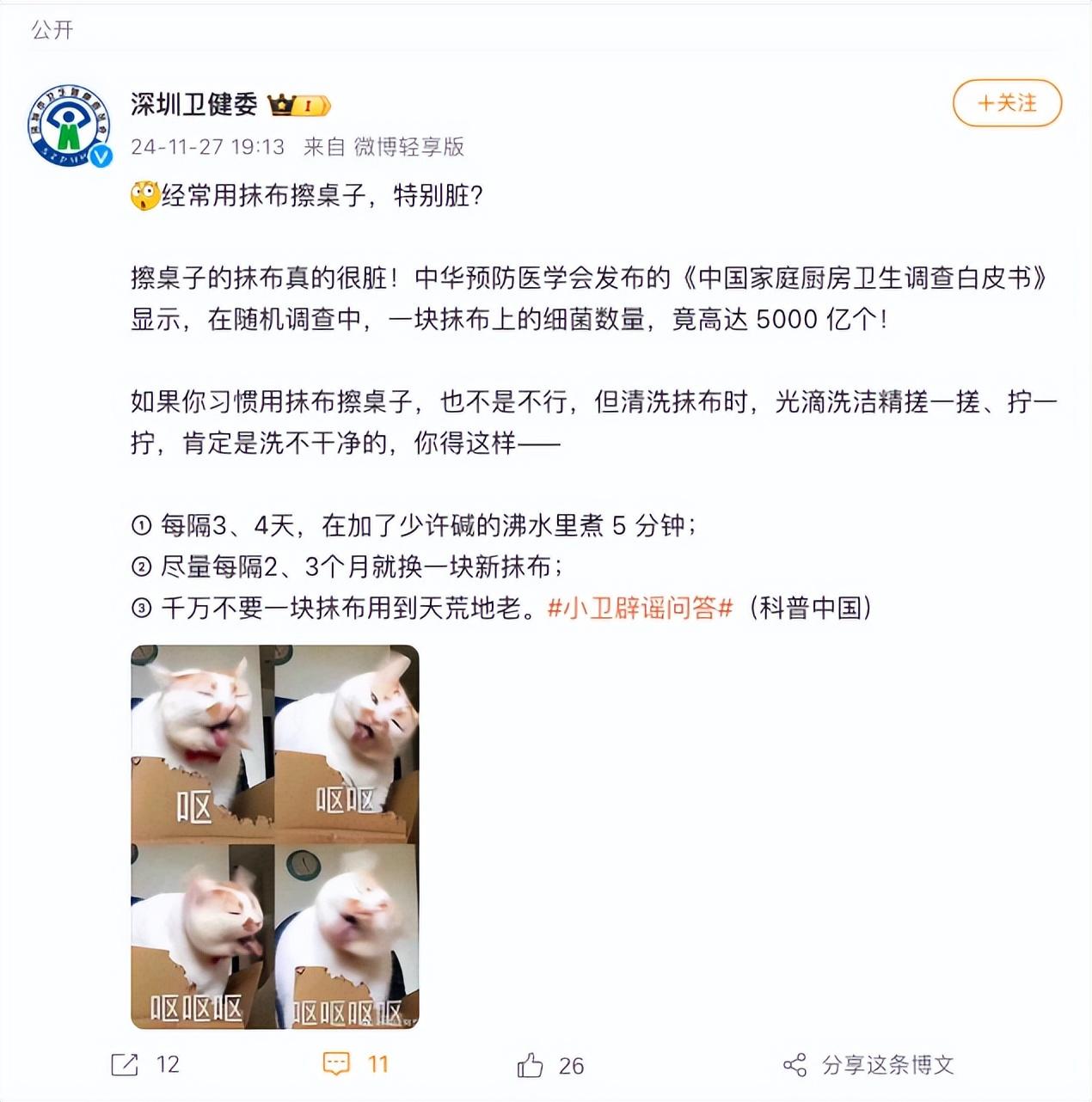 深圳衛健委曾分享過一項來自中華預防醫學會的調查結果,該調查顯示在《中國家庭廚房衛生調查白皮書》中,隨機抽取的抹布上細菌總數可高達約5000億個,其中包含大腸桿菌、金黃色葡萄球菌等致病菌。長期使用這種抹布擦桌子、洗碗,很容易導致餐具、餐桌、廚房檯面二次污染。