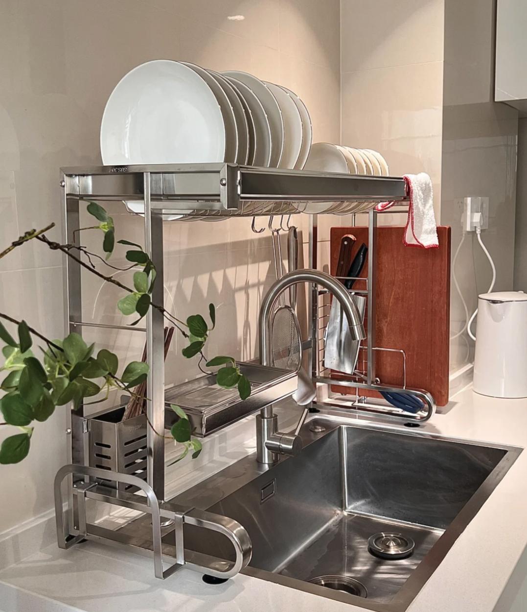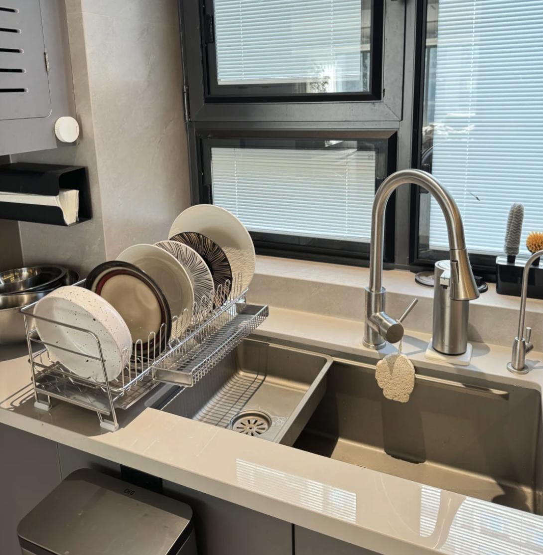 其實一臺消毒櫃或洗碗機就可以有效解決這些問題,但很多家庭是沒有安裝的,所以碗盤清洗後,還是更建議立放,比如空間足夠的話,水槽旁就可以擺個不鏽鋼的瀝水架,通風晾乾、隨取隨用,省心又衛生。