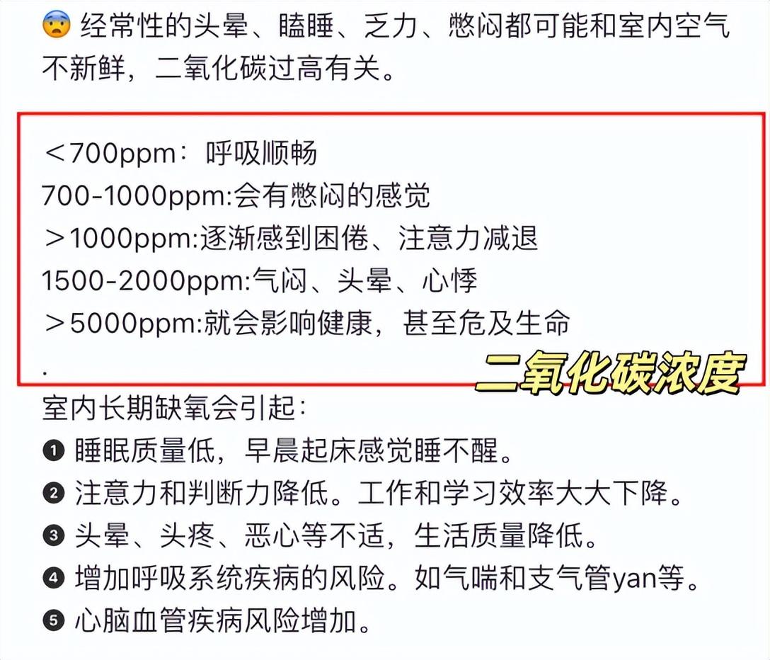 其實這樣是很不健康的。人在室內會快速消耗氧氣,產生二氧化碳。如果室內不通風,二氧化碳就會累積,當室內二氧化碳濃度越來越高時,對人就會產生諸多危害。(如下所示)