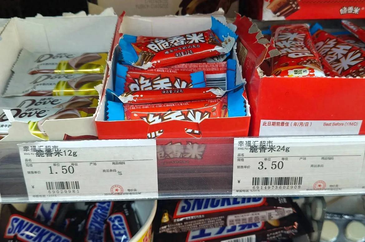 比如上圖的脆香米,12g的1.5元,24克的居然要3.5元,算下來,量多的足足貴了16%.