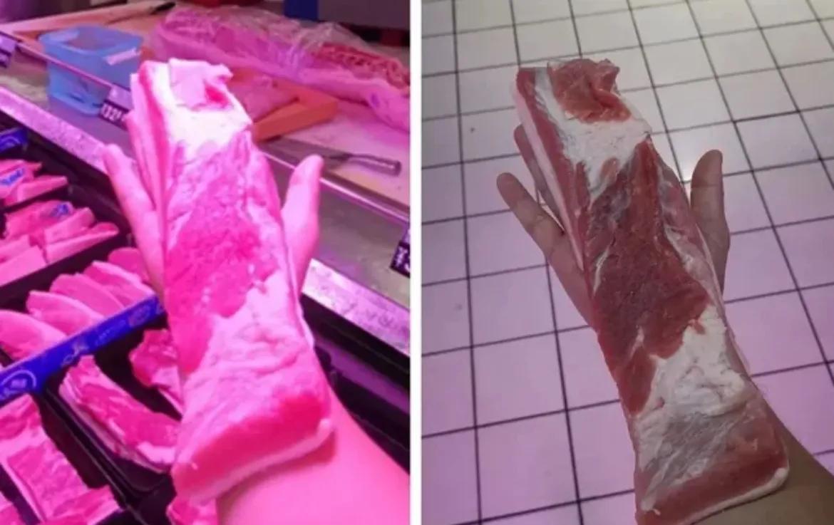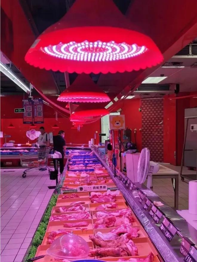 當然,有一些地區,肉品區已經明令禁止用“生鮮燈”了,因爲它的確會改變肉的顏色,從而導致大家對肉品新鮮度誤判,但還有一些地區依舊再用,如果大家遇到,一定要拿到正常光線下,再決定購買與否。