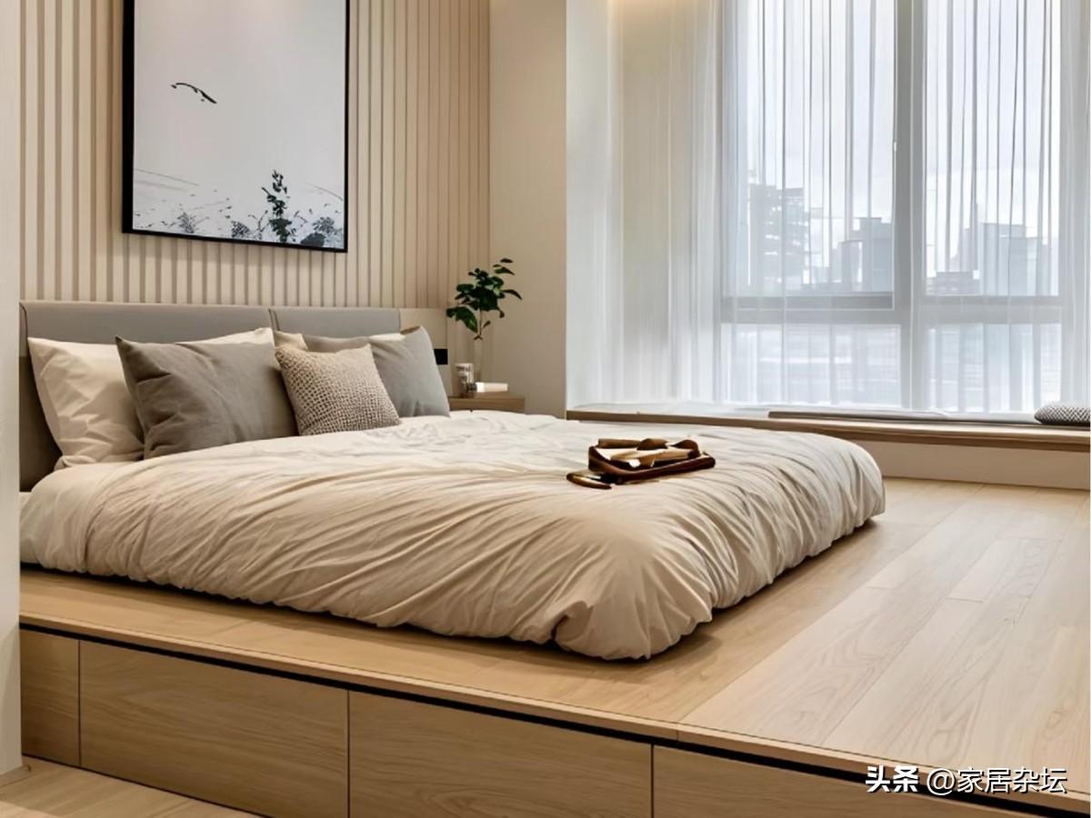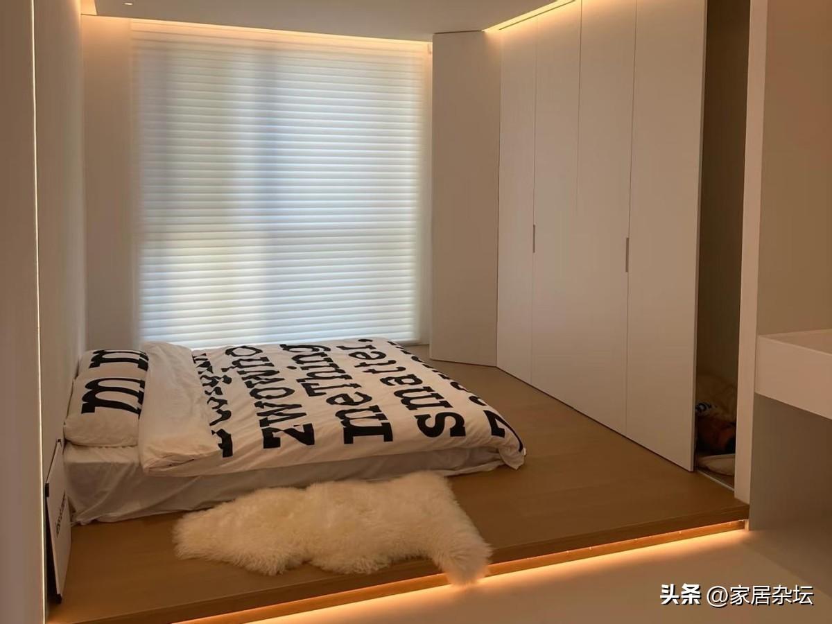 ①、地臺牀代替傳統牀。整個臥室,打上了地臺。用木板做的地臺,在地臺上鋪上牀墊,就形成了牀。