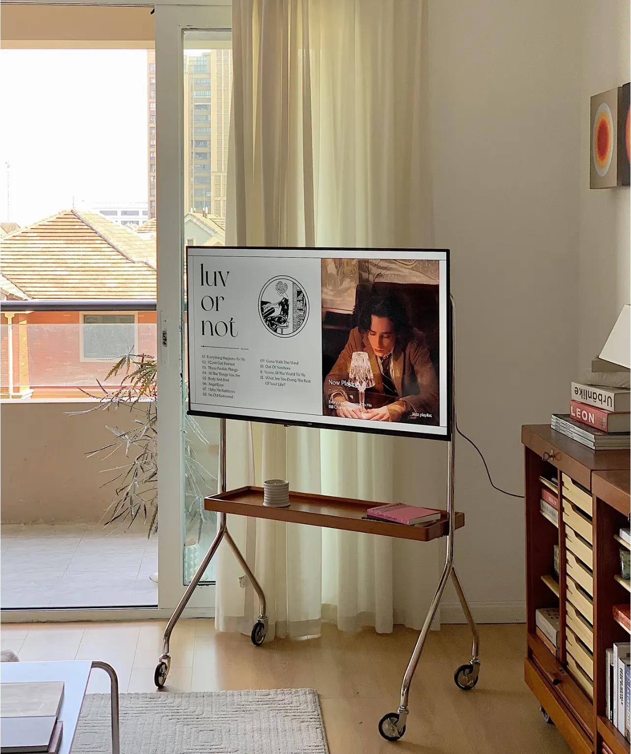 其四,電視支架目前也夠爭氣,一直在嘗試玩新花樣,有玩豎屏的、有帶收納的,甚至還有B&O這種,買支架送電視。