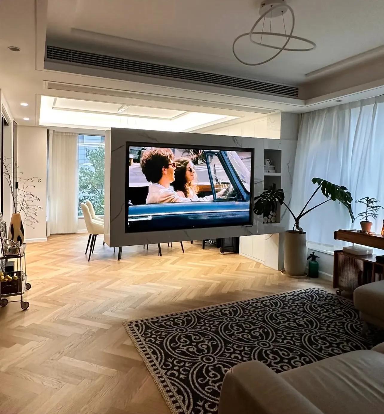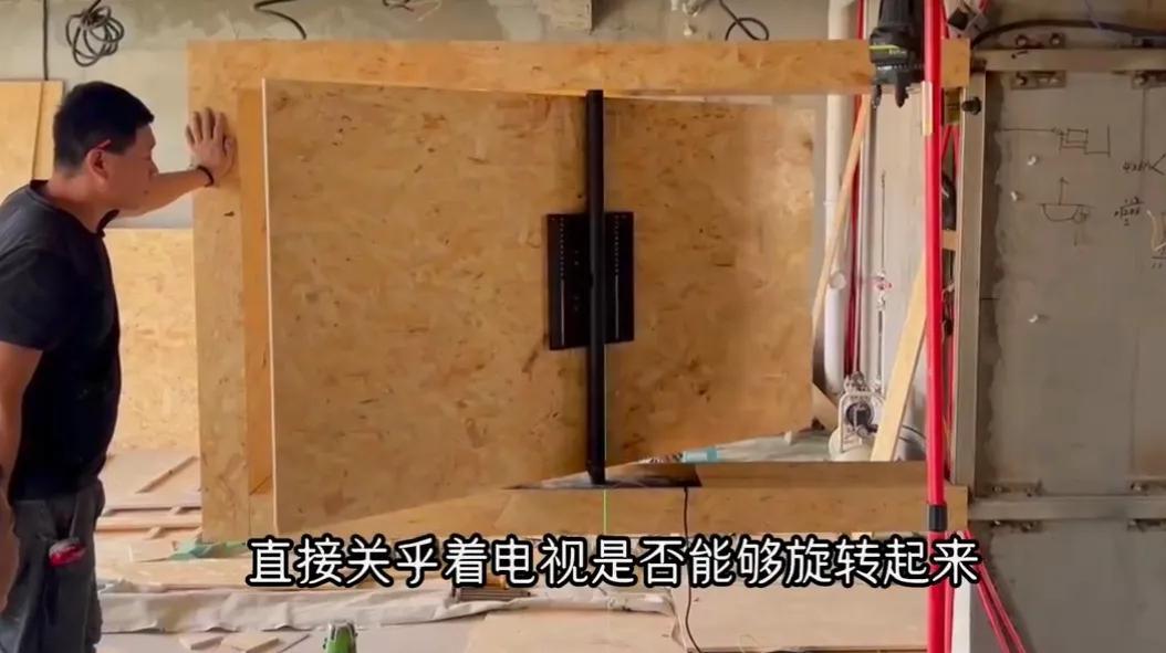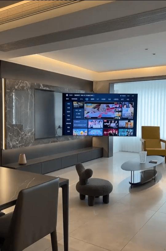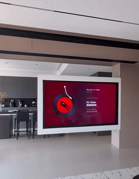 這一面旋轉電視牆,一共花費4000多,與很多普通的電視牆花費是相當的,但是它是隔斷的兩頭都可以看電視,旋轉指令還可以接入智能家居,語音、敲擊……方式都可以旋轉!
