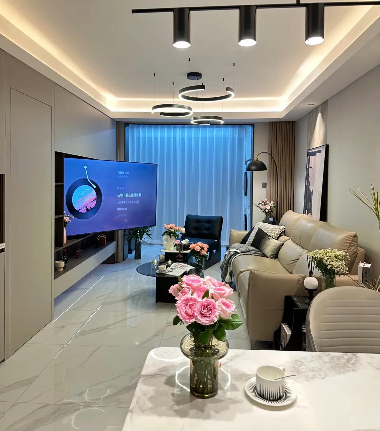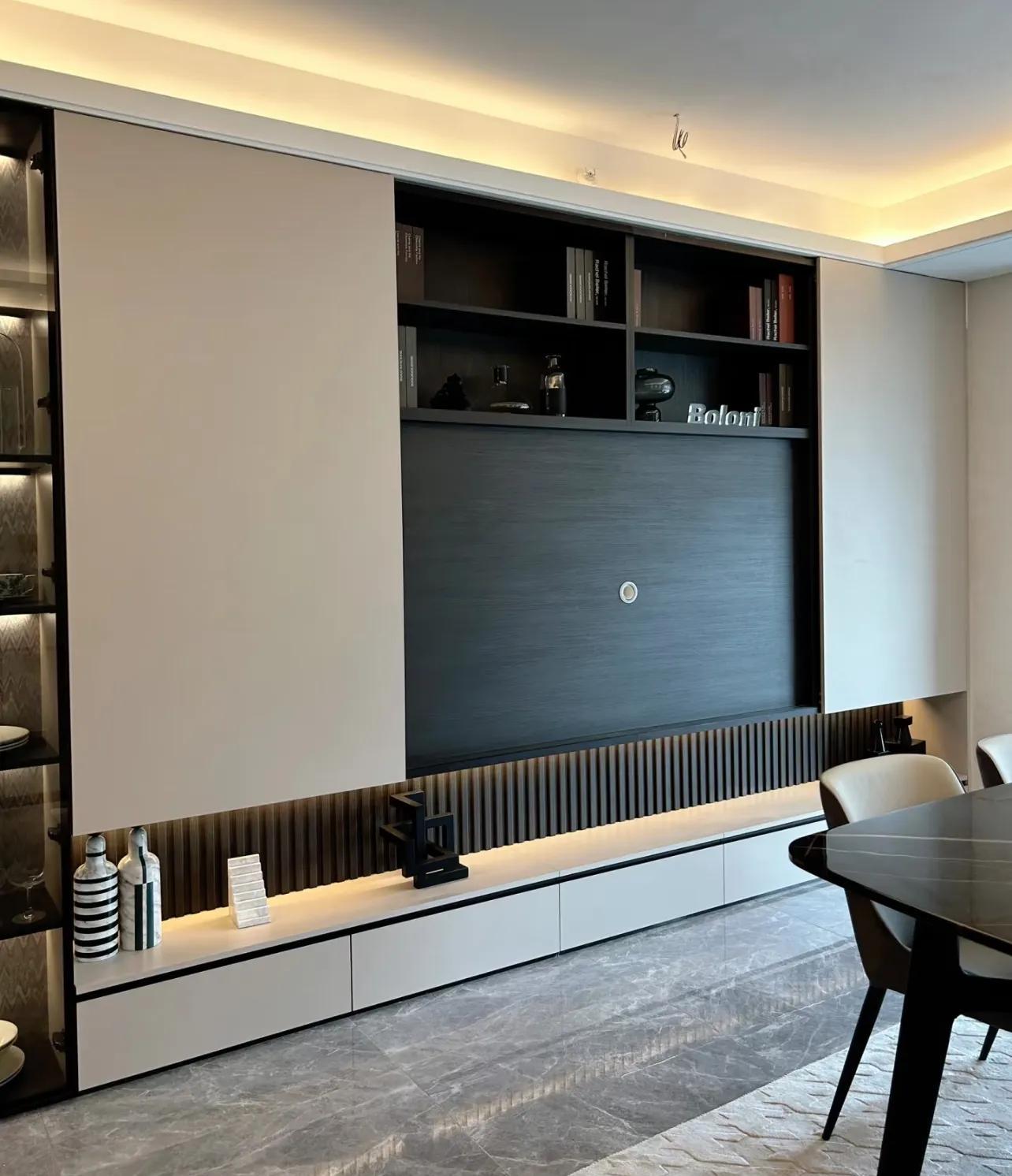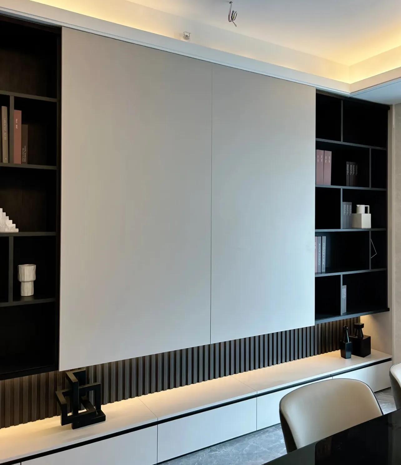 這一面旋轉電視牆,一共花費4000多,與很多普通的電視牆花費是相當的,但是它是隔斷的兩頭都可以看電視,旋轉指令還可以接入智能家居,語音、敲擊……方式都可以旋轉!