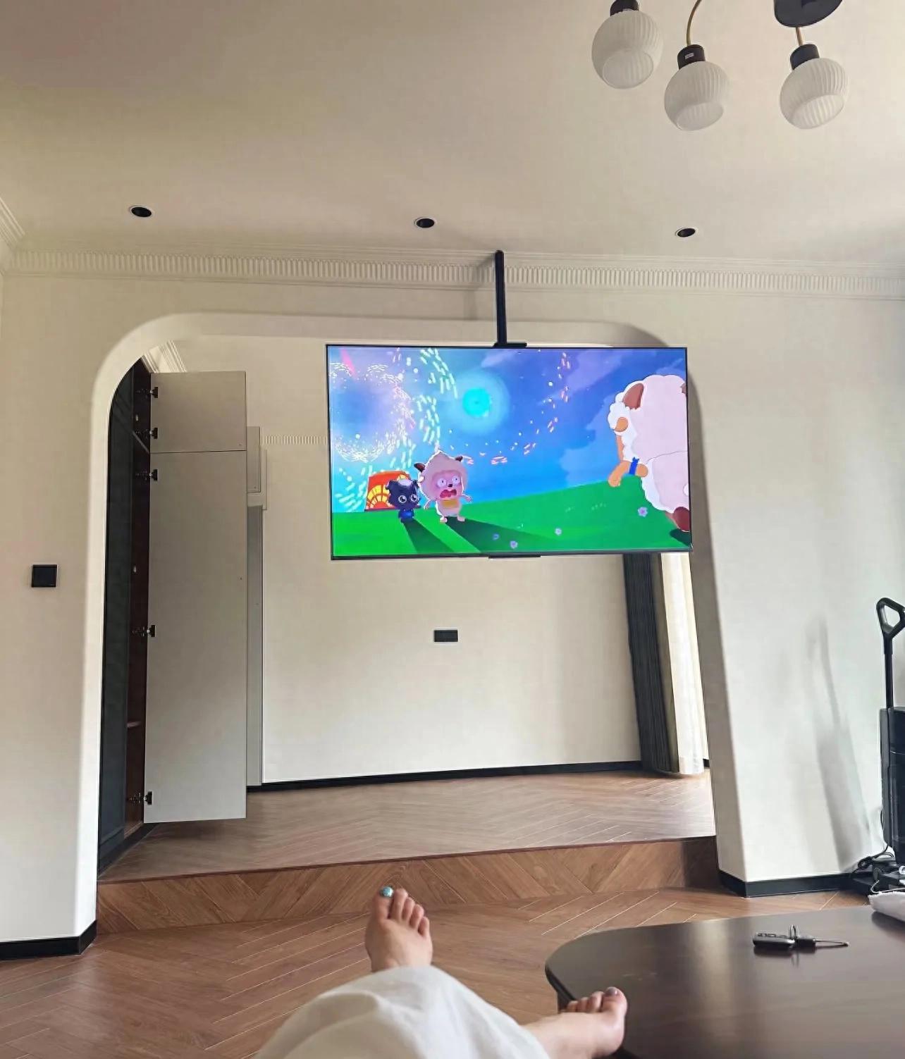 於是誕生了伸縮旋轉支架,同樣是掛牆,但這個掛架,它是支持旋轉的,客廳也能看。