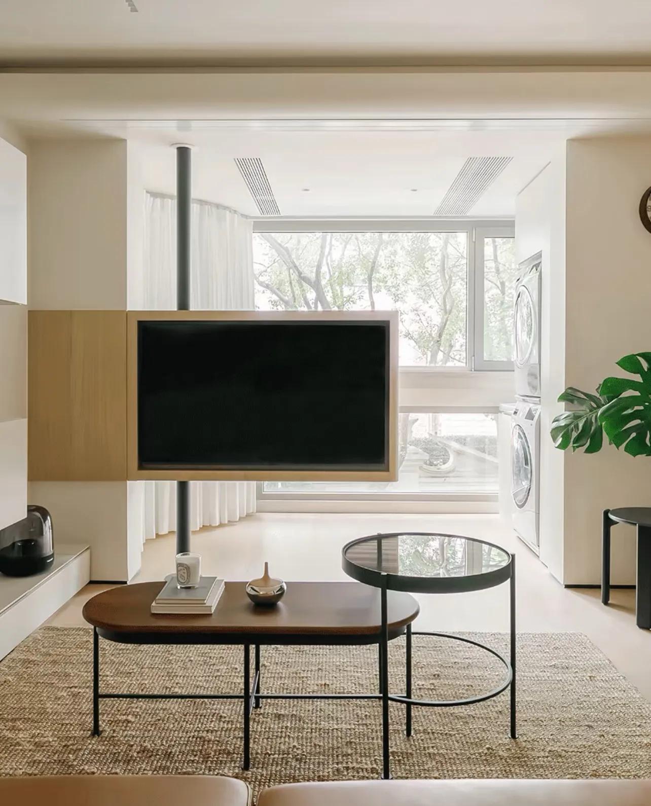 看電視時,電視旋轉對着客廳,不看電視時,電視旋轉一下,也不影響去陽臺的動線。