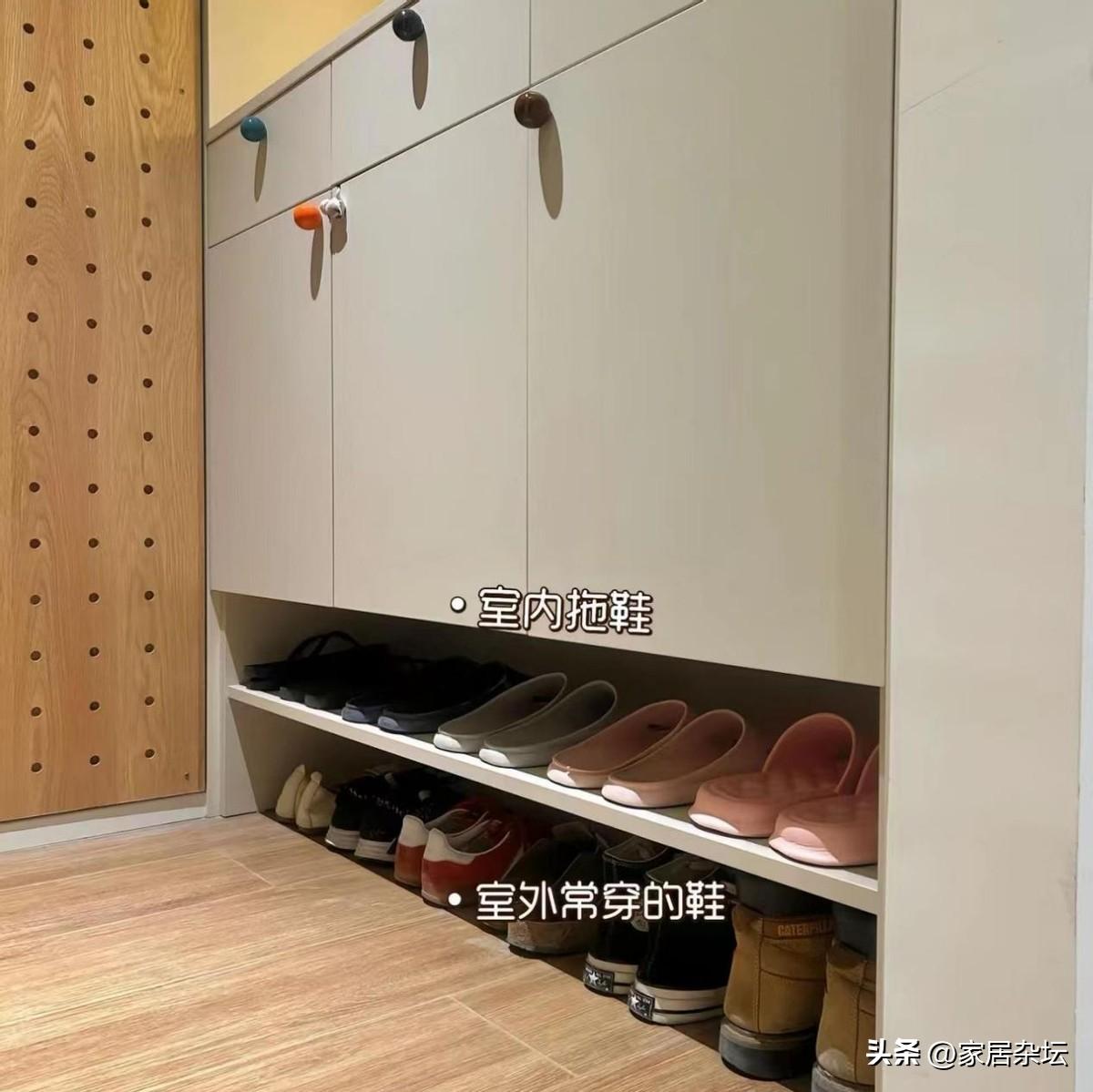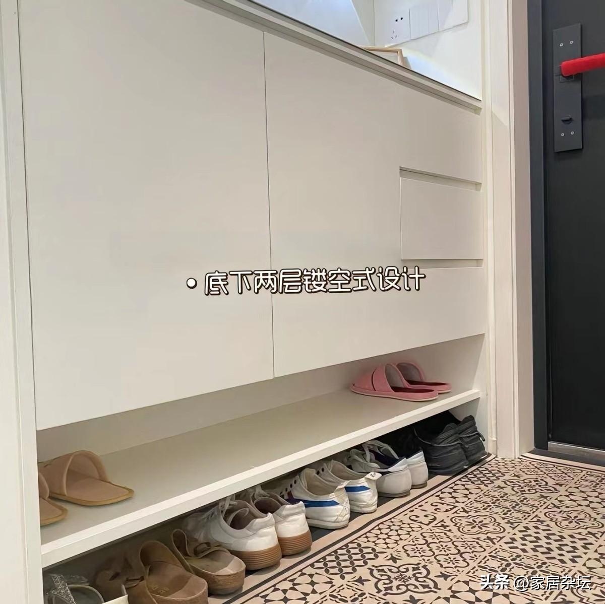 而個人給大家推薦的一個小細節,是鞋櫃底部留兩空。最底部是落地的,上面那個孔是敞開式的,下面有一層層板。