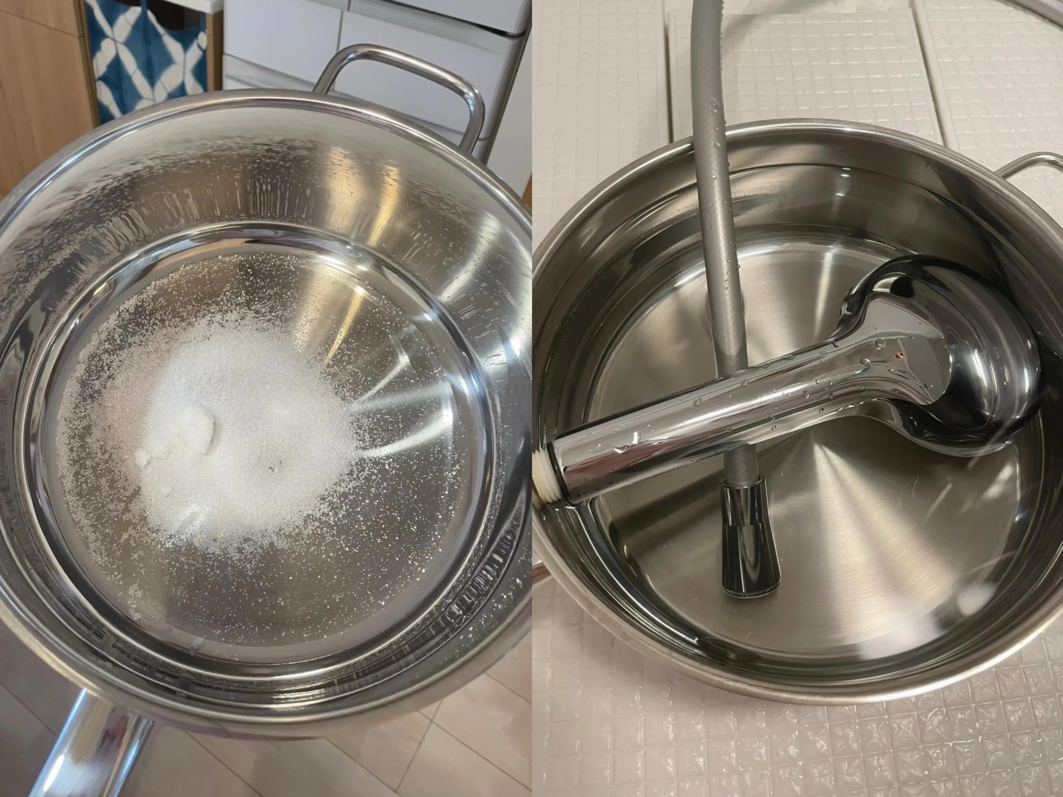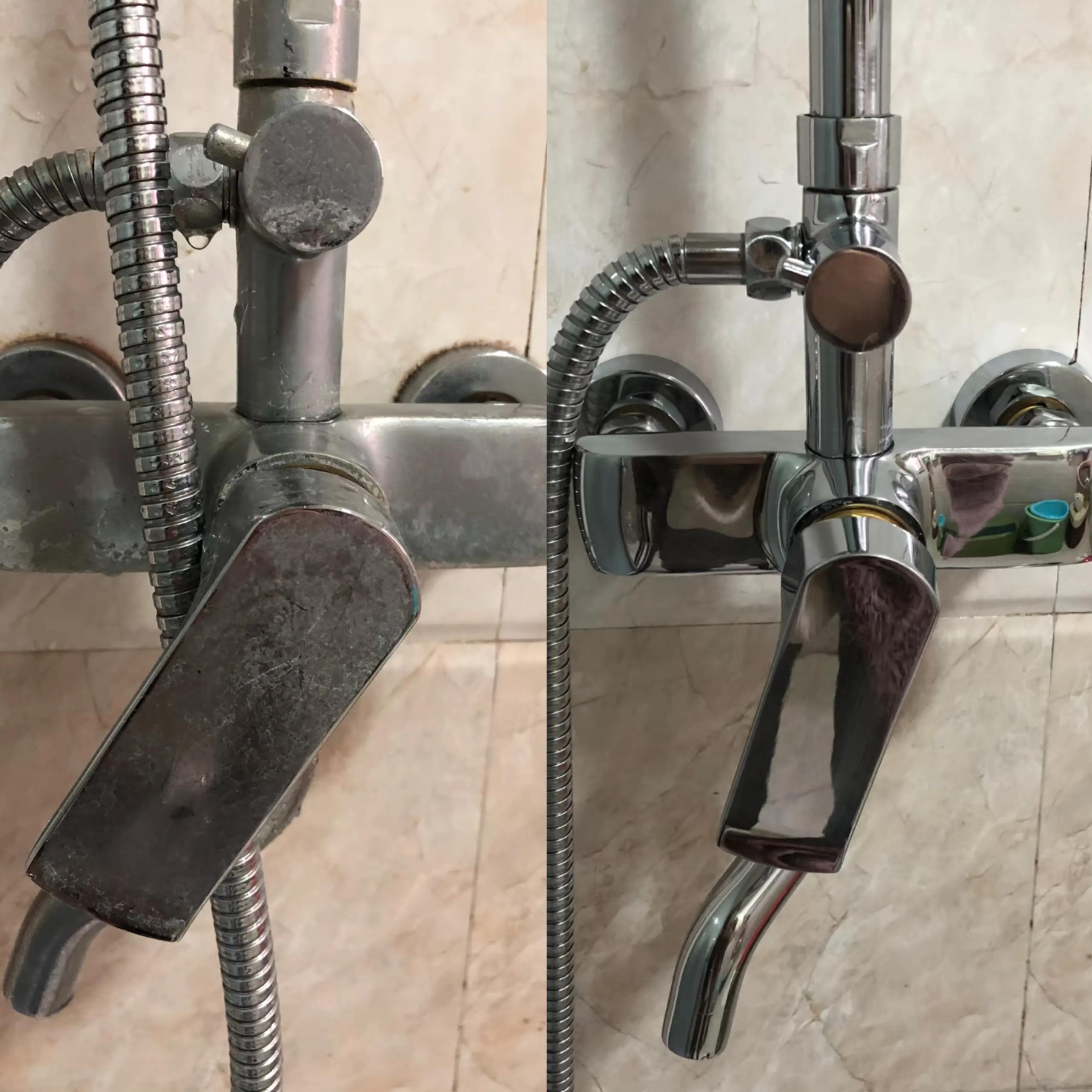 檸檬酸酸性溶液,可以與水垢產生酸鹼中和反應,所以它還可以清潔家裏所有涉水有水垢的東西,比如水龍頭表面、花灑表面、淋浴玻璃表面……