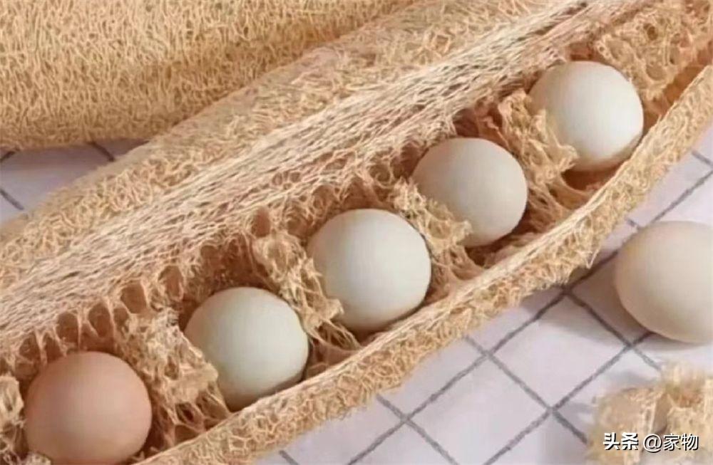 一整個絲瓜絡撕開,再掏上幾個小格子,裏面就可以收納下七八枚雞蛋。