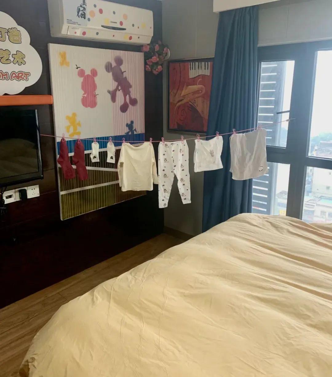 繩子上都是防風防滑夾子,衣服夾上去穩穩的,不會滑到中間堆着晾不幹。小朋友每天換洗衣物,都有地方可以掛着晾乾。