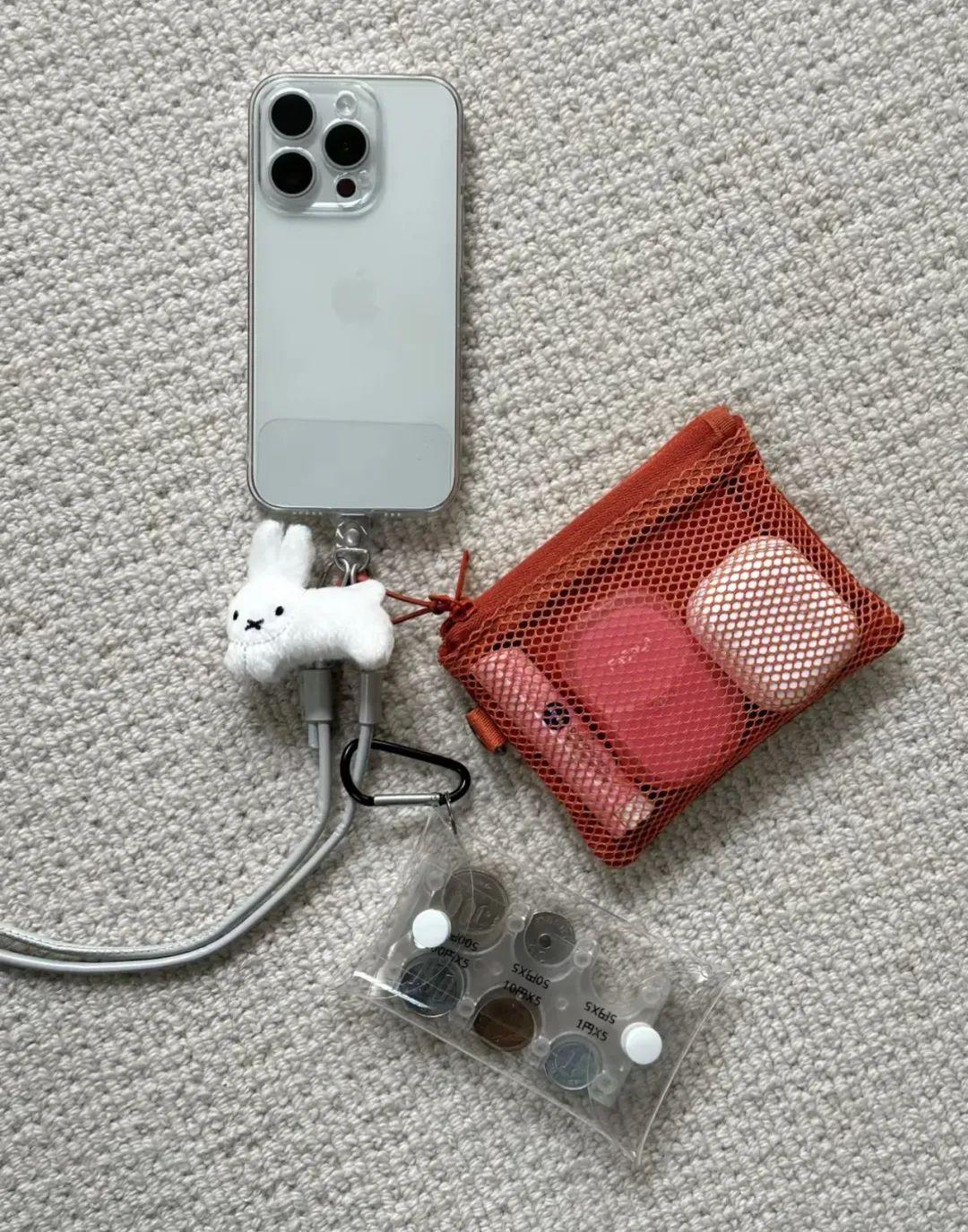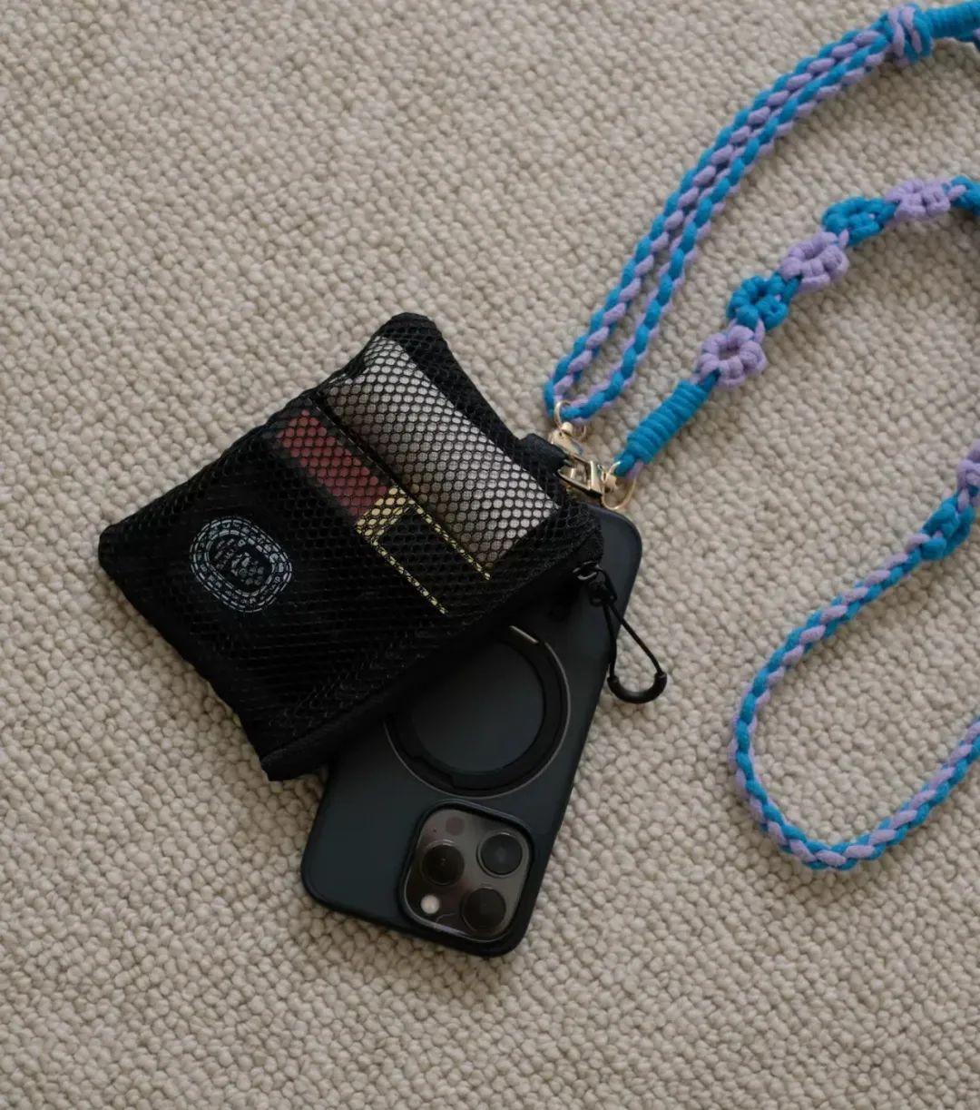 它既可以掛手機,還有個網狀的小收納包,放一些出門要用的小東西,口紅、紙巾、耳機等等~