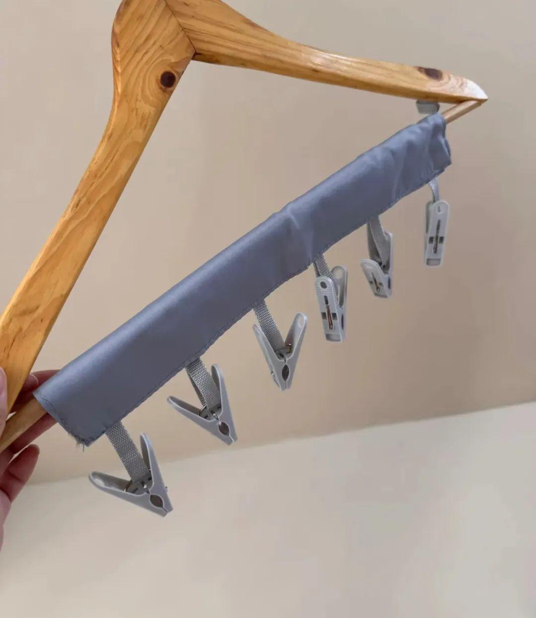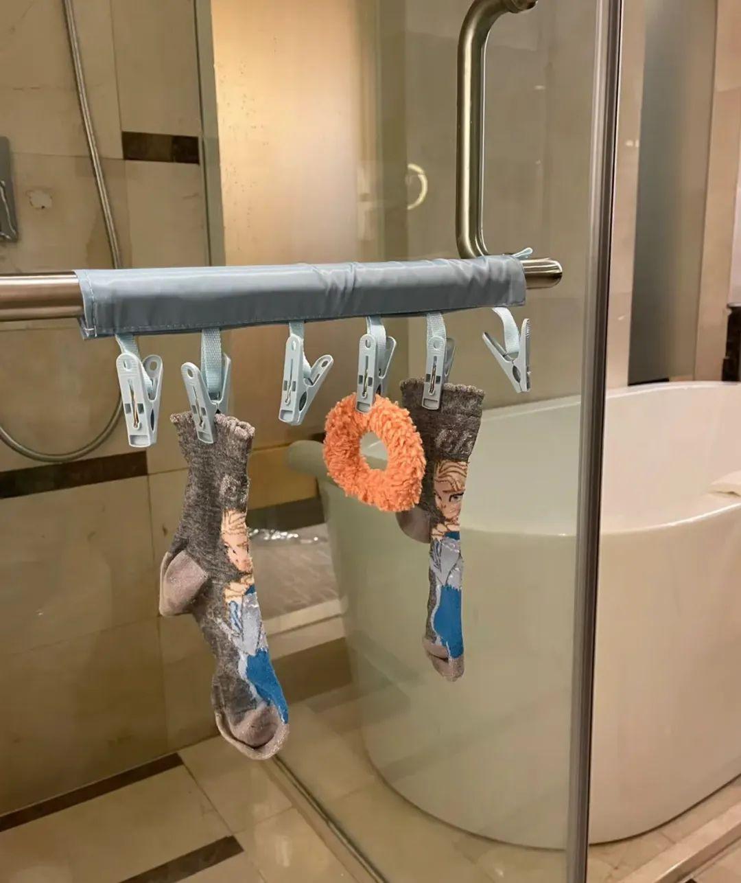 即使酒店有備用衣架,我們也不放心直接接觸掛貼身衣物,但如果帶上這種布袋衣夾,晾衣服的同時又不用接觸這個公用衣架,非常完美。