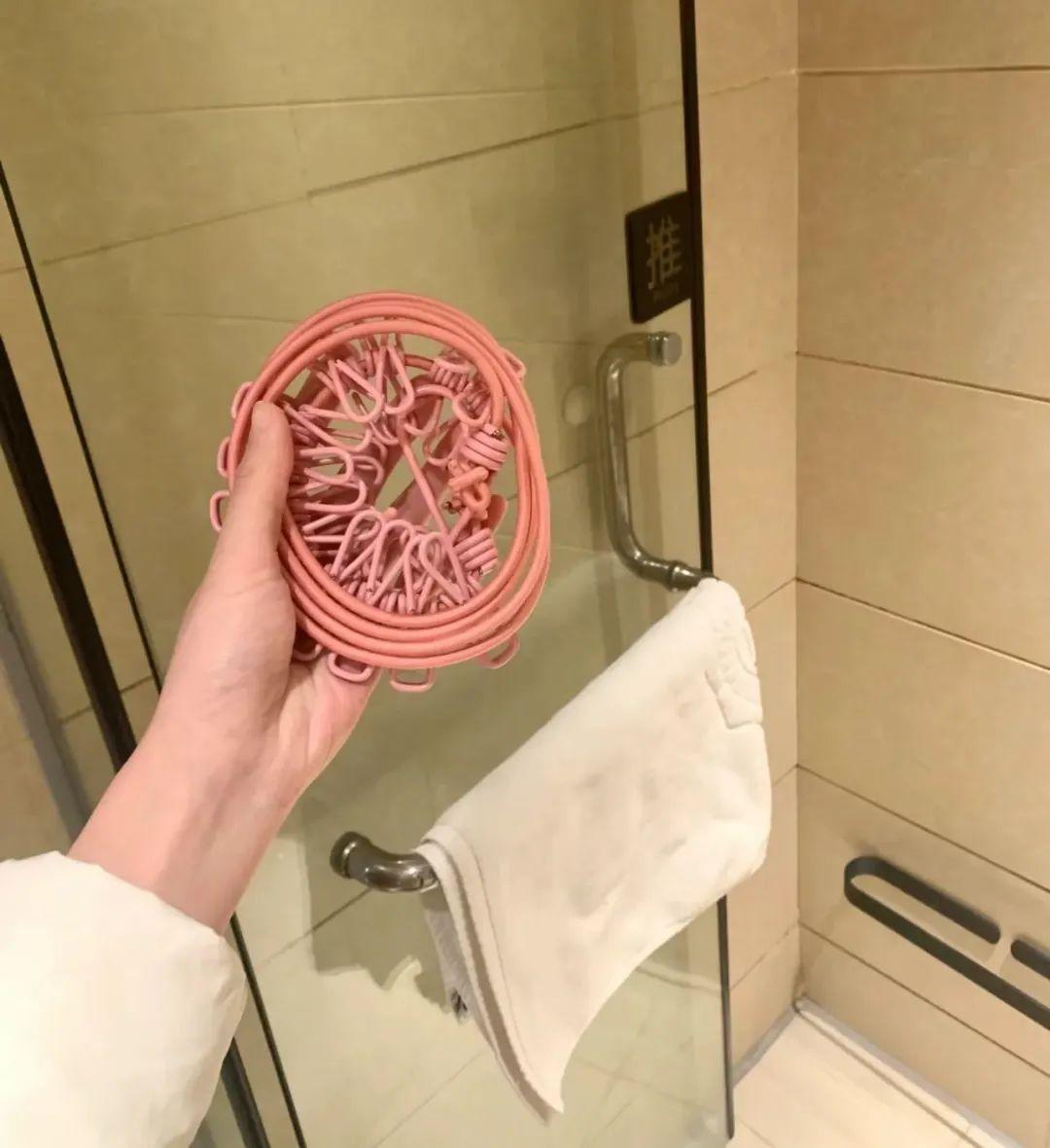 這玩意兒摺疊起來就手掌那麼大,放在行李箱裏,一點兒不佔地方。它兩頭是 U 型掛鉤,隨便找個能勾住的地方就能掛。