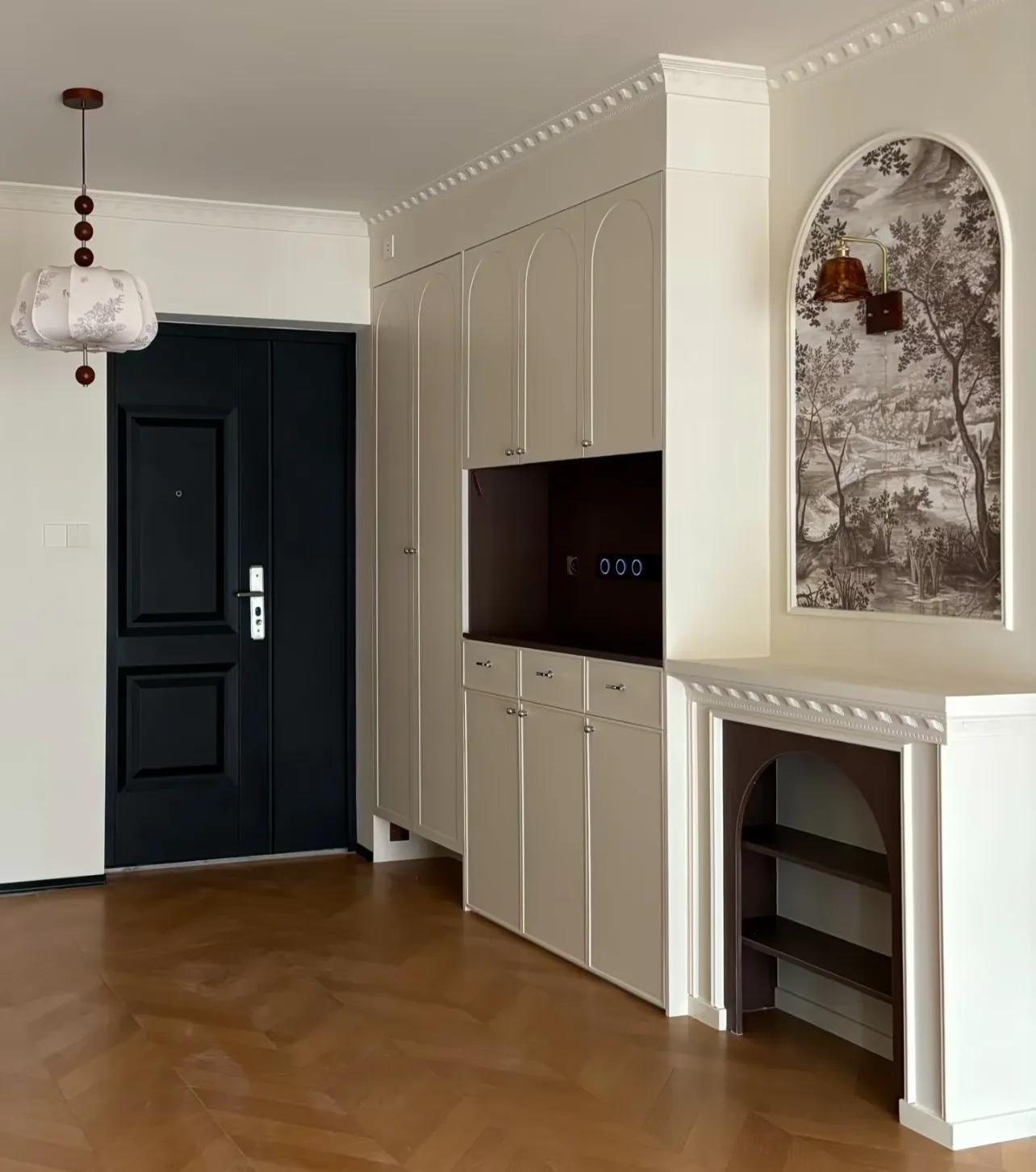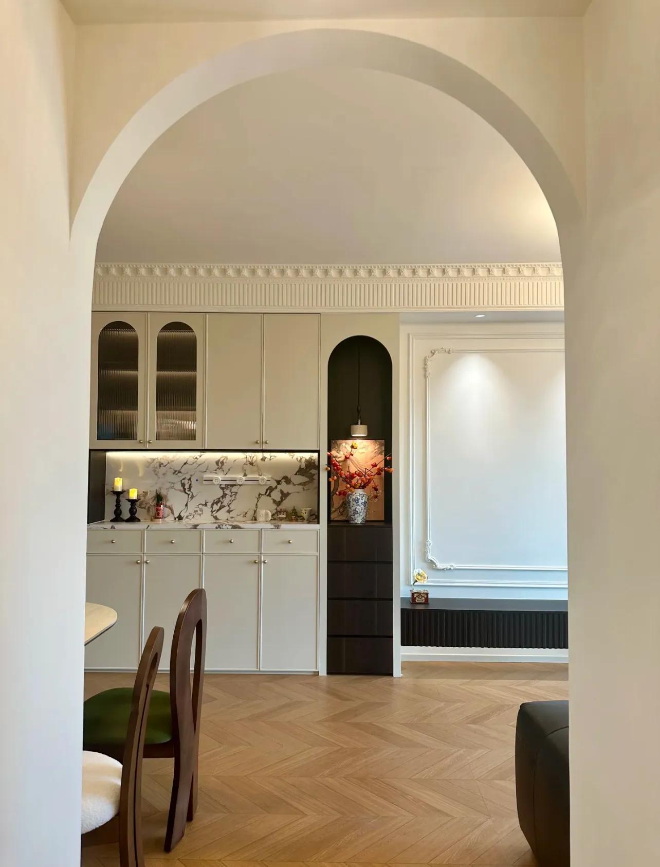 石膏線+拱門,拱門也是復古風常見的元素,用在小戶型中,能增加一些靈動、優雅的感覺;