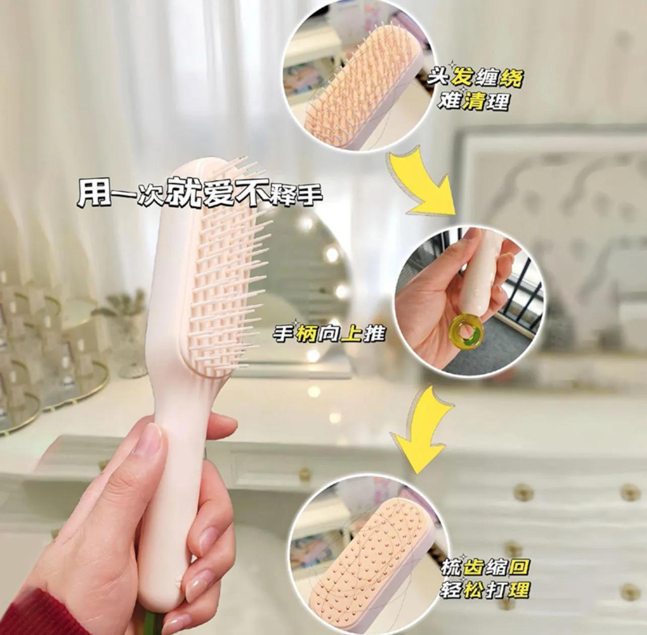 而這個伸縮梳,外表看着平平無奇,實則內藏玄機,底部的小圓環一推,梳齒就能自動縮回。
