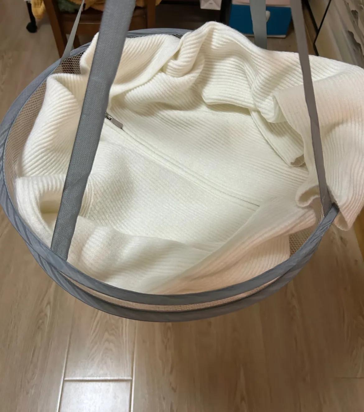 而且,像掛起來容易變形、肩膀起鼓的毛衣,也可以放進它裏面晾,別看過程不好看,但結果絕對是衣服不受一絲絲損害。