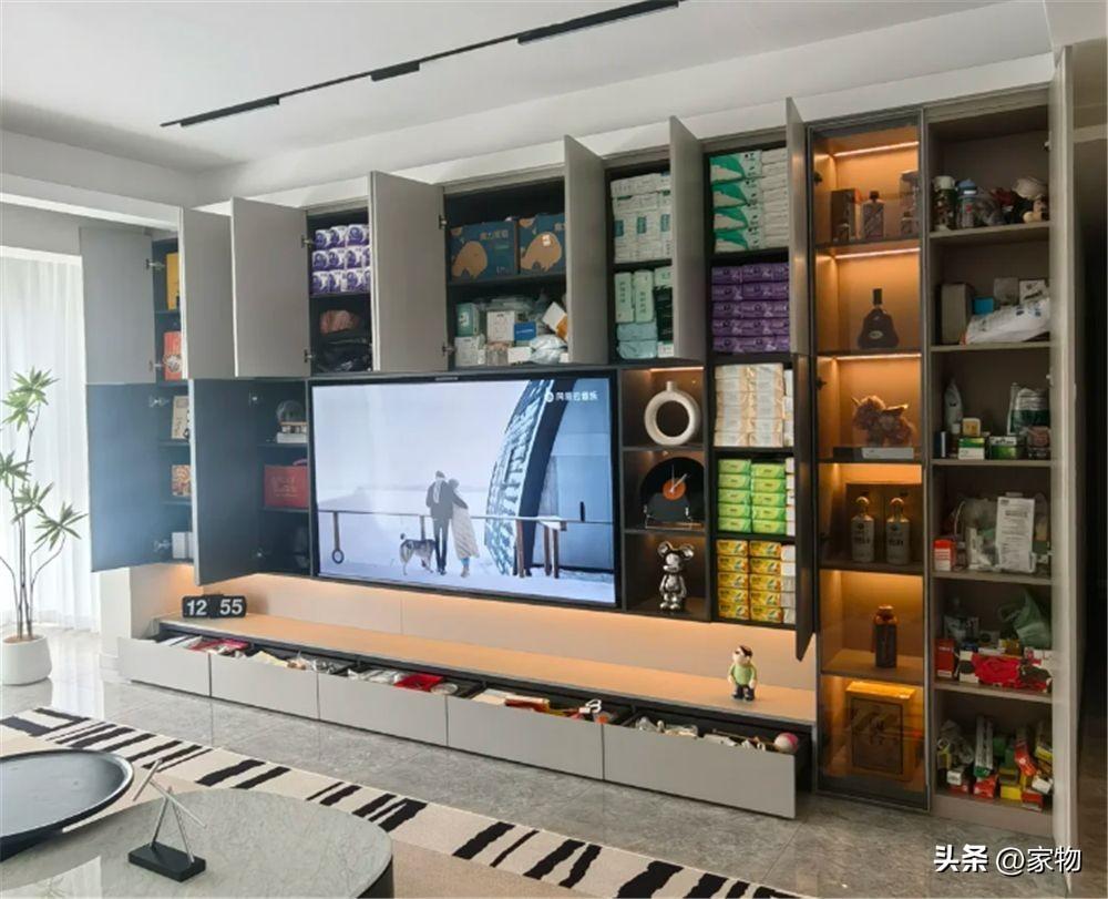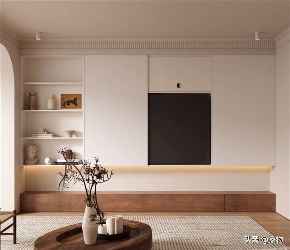 又比如一些牆壁內凹的格局,甚至可以將電視隱藏在凹陷區域內,櫃門板一關,電視牆和兩側牆面持平,又能收納又顯整潔。