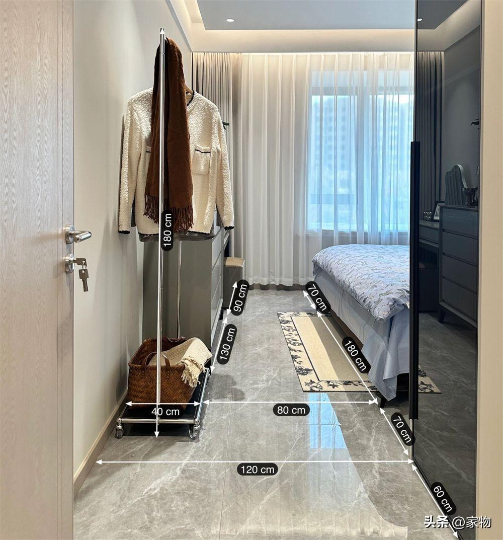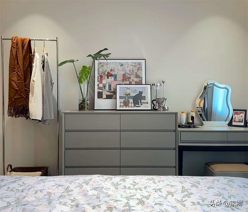 甚至,還可以增加一個小小的開放式晾衣架,不僅能掛每天的次淨衣物,同時也相當於裝飾點綴,進一步豐富了大面積臥室的利用率,可謂是又好看又實用。