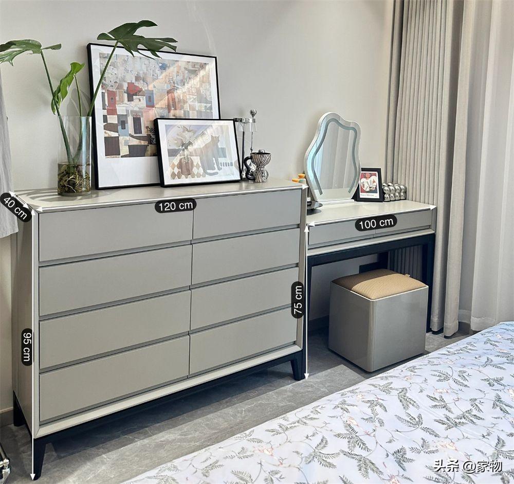 若到這一步,牀尾和剛纔我說的一樣,有1米2的寬度,可以發給一張深度在40的桌櫃組合,將牀尾過道的寬度壓縮到80,櫃子收納小件衣物,梳妝檯也可以滿足梳妝和日常工作需求。