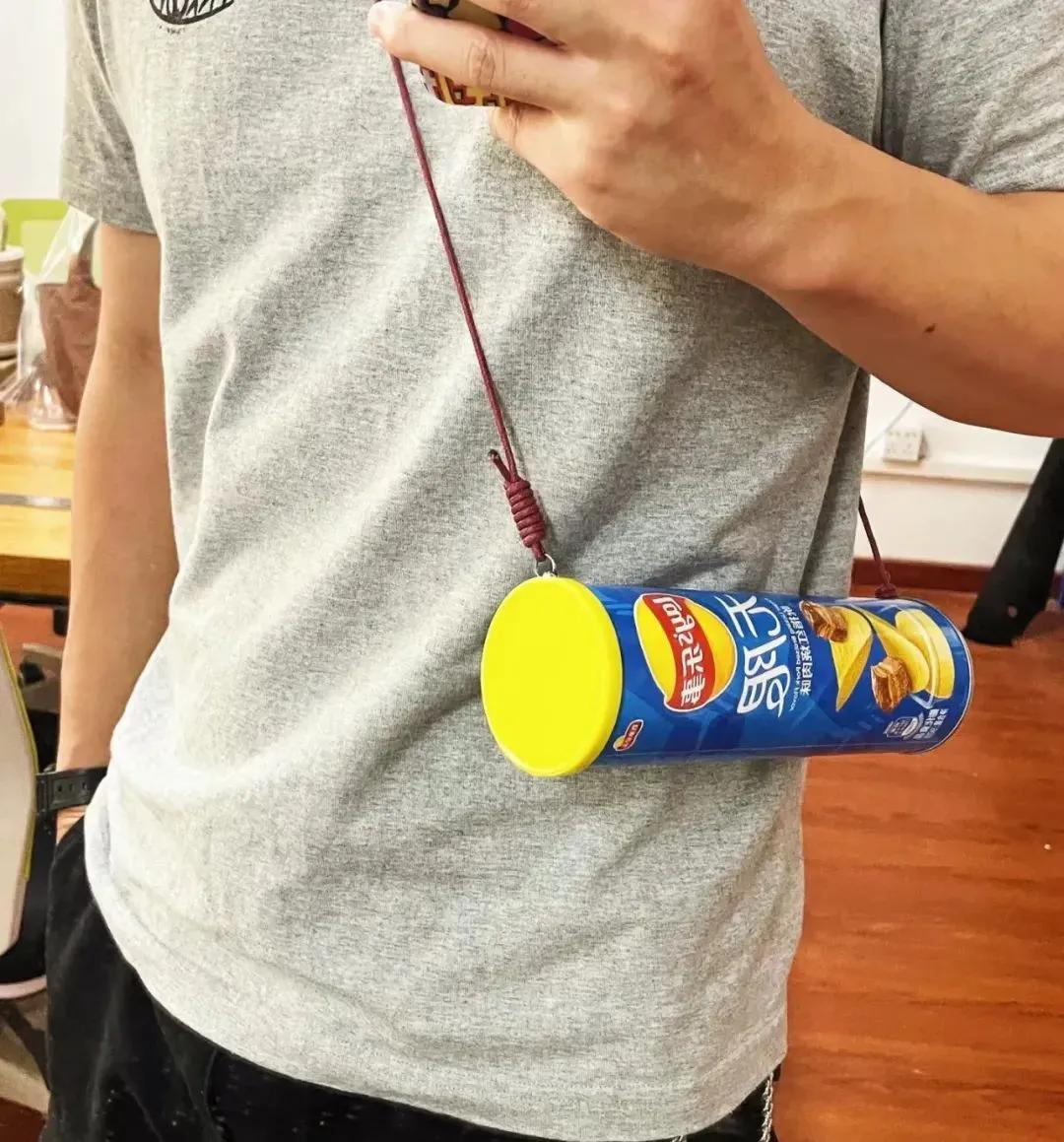 甚至,爲了方便,還可以給薯片盒綁上揹帶揹着,隨用隨取。