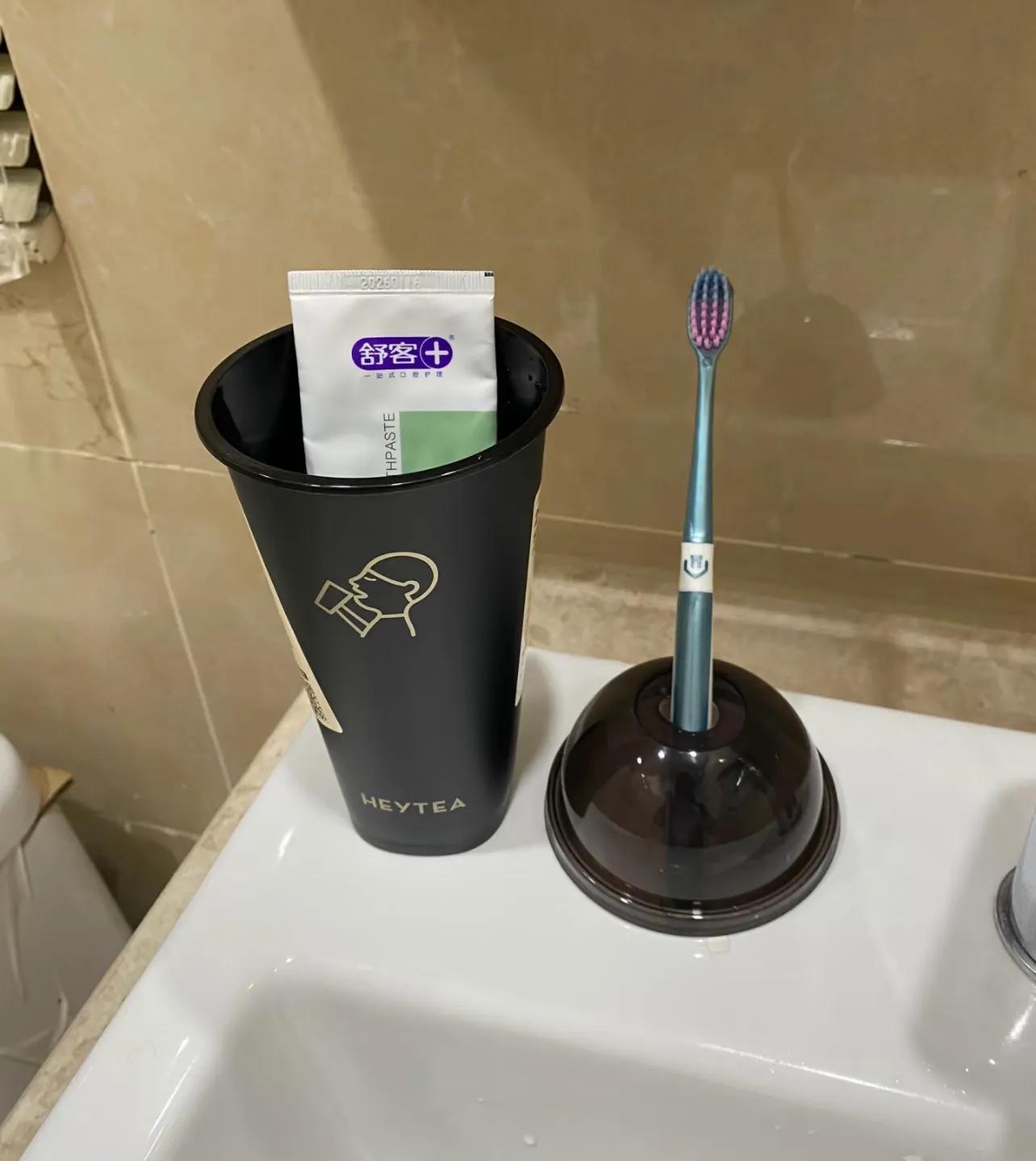 然而,在看到用奶茶杯當洗漱杯的那一刻,我碎了,連同我的智商一起。