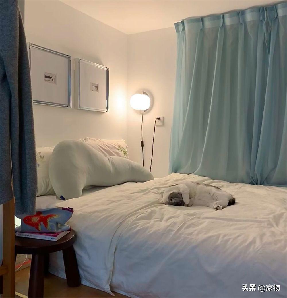 二樓電視區旁邊,就是家裏的臥室,這裏佈置就要更簡單一些了——一張雙人牀、一道隔斷布簾,就可以將睡眠區和電視區進行隔斷,與此同時,臥室也有一扇窗,相當於是南北通透了~