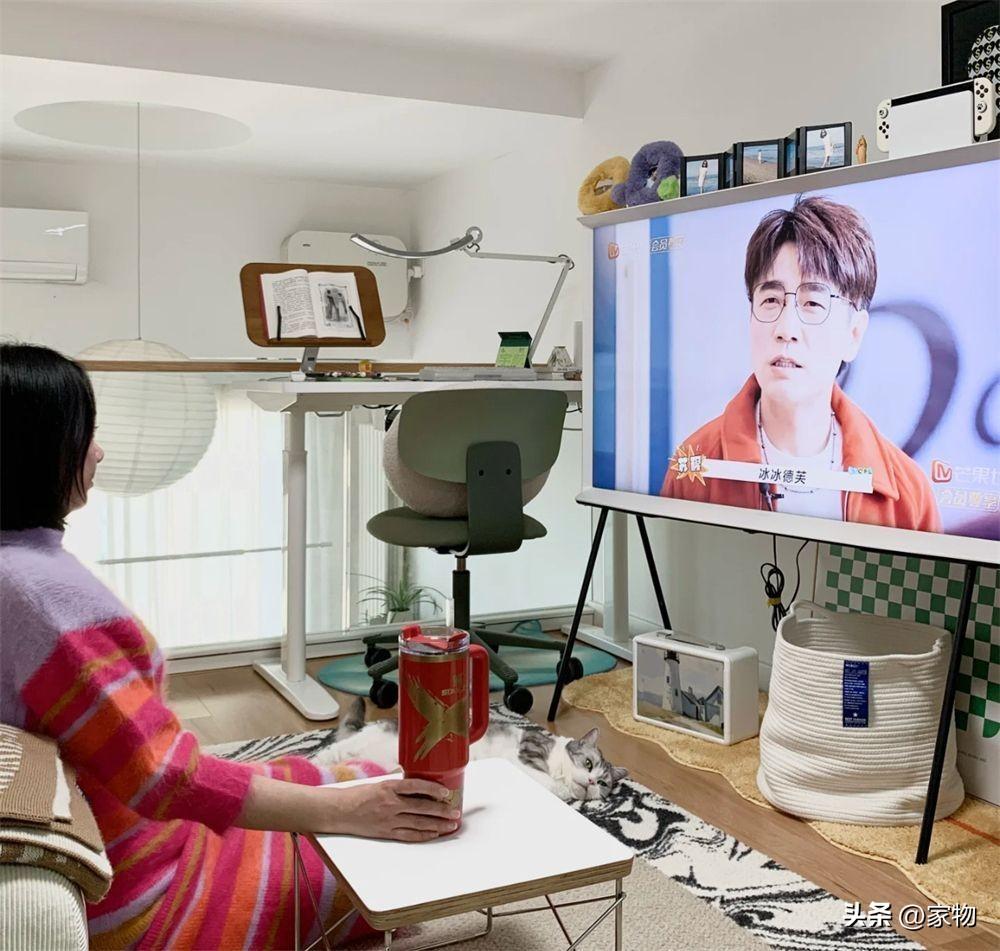 雖說一層客廳內沒有電視,但要知道,這可是間LOFT,她在剛一上二樓的隔層處,放了一臺支架電視,搭配懶人沙發和邊幾,活脫脫一個第二客廳觀影區。