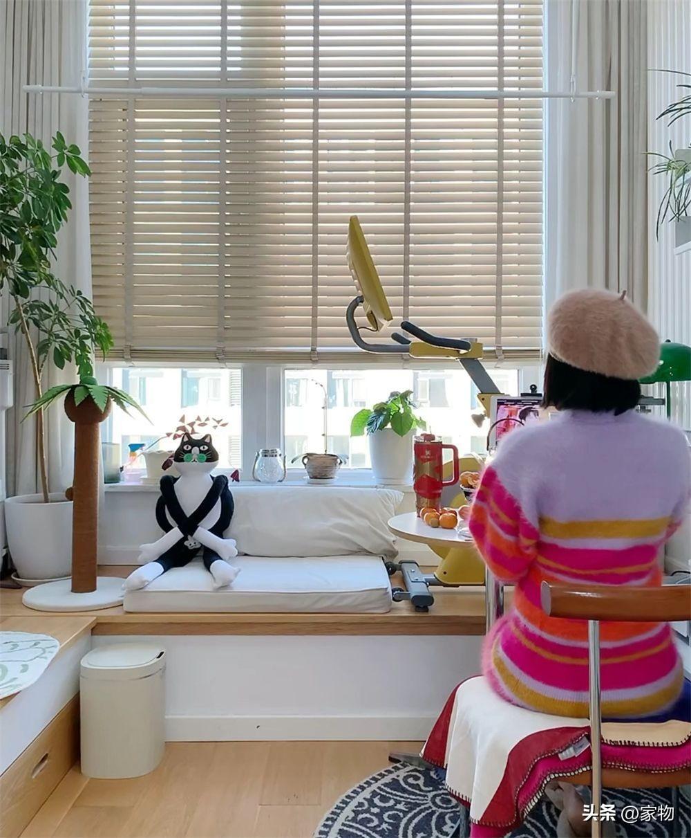 家裏客廳空間很小,而且還帶一個飄窗,她乾脆利用飄窗空間放動感單車,再在旁邊做組合櫃,打造出一個角落健身區和收納空間。