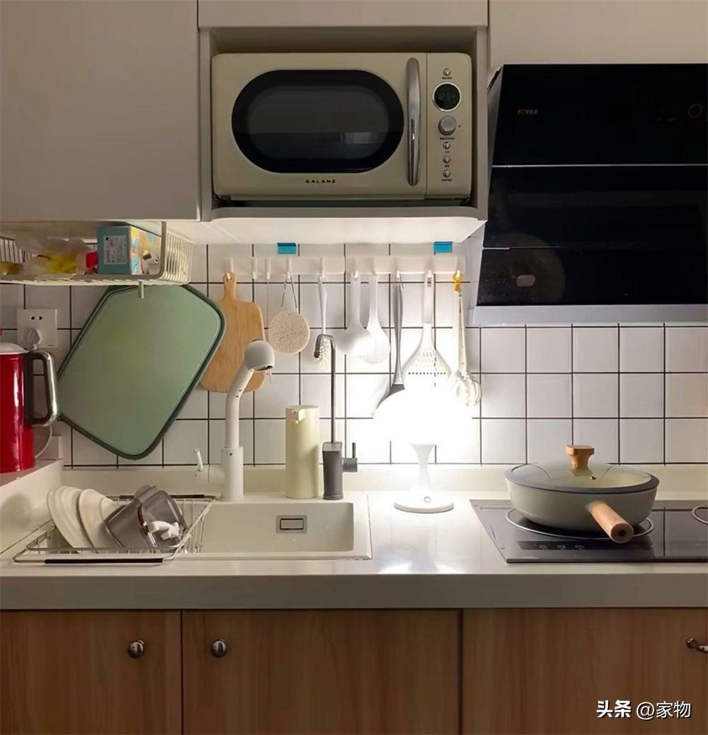 廚房就在一進門右手邊的位置,自然是做成開放式廚房,吊櫃和底櫃收納日常的烹飪用品,各種餐廚具或是掛在牆上,或是放在瀝水籃裏,東西雖多,卻井然有序。