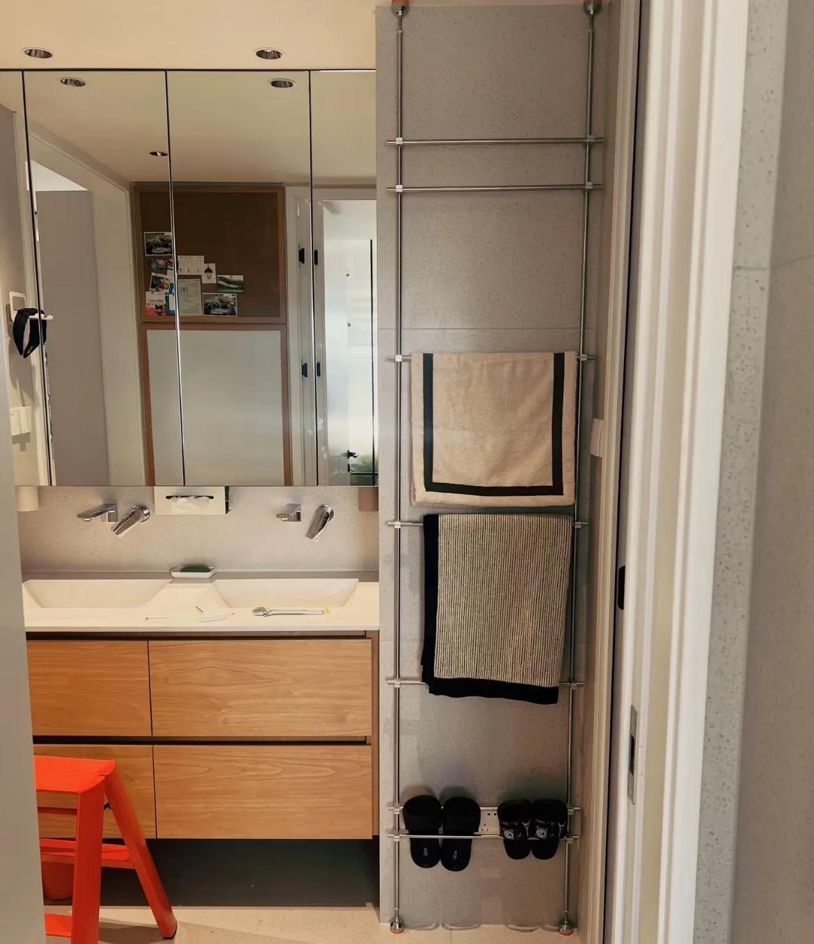 如此一來,取用照常方便,毛巾平展鋪開也能更快晾乾,因爲空間大,上面甚至可以收納髮夾、皮筋、下面放置拖鞋,功能都要趕上一個薄櫃了。