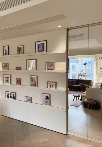 在移門的基礎上,再做成照片牆,每次開門時,都有一種“機關門”的神祕感,移門的軌道下方也不閒着,藏一面超級大鏡子。
