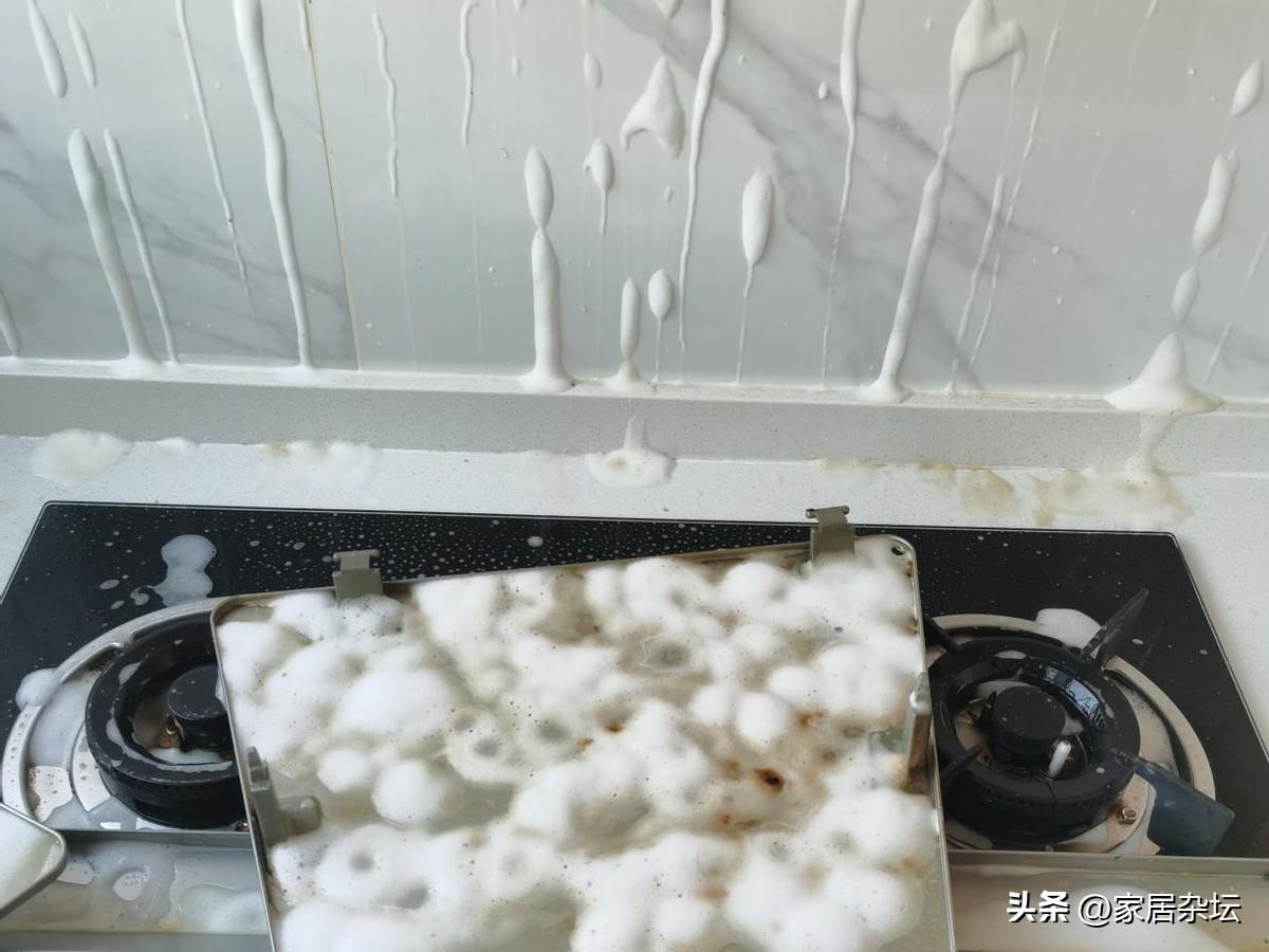 因爲我們已經噴完了廚房油污淨。廚房油污淨的所有的泡沫,已經將有油污的地方覆蓋。
