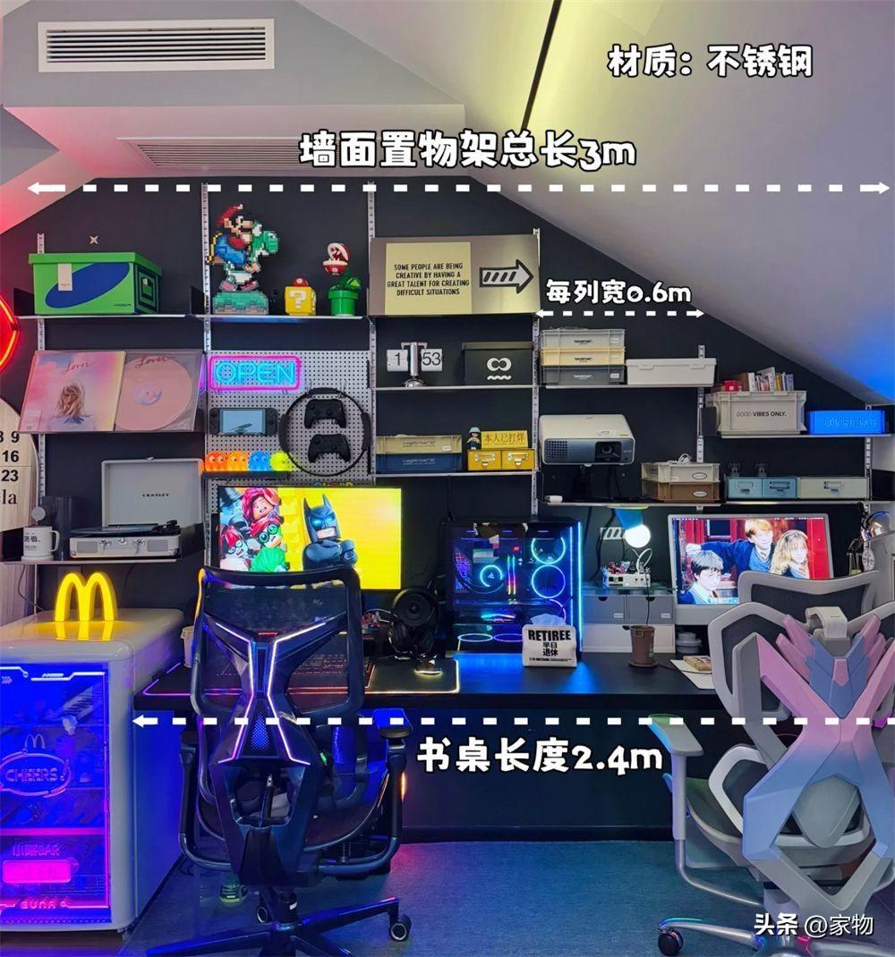 更不用說,牆面的造型,也正好順應着閣樓的斜頂進行佈置,做了活動式的收納架,方便放一些遊戲外設、擺件和其他雜物,頂部留出中央空調出風口,恰到好處。
